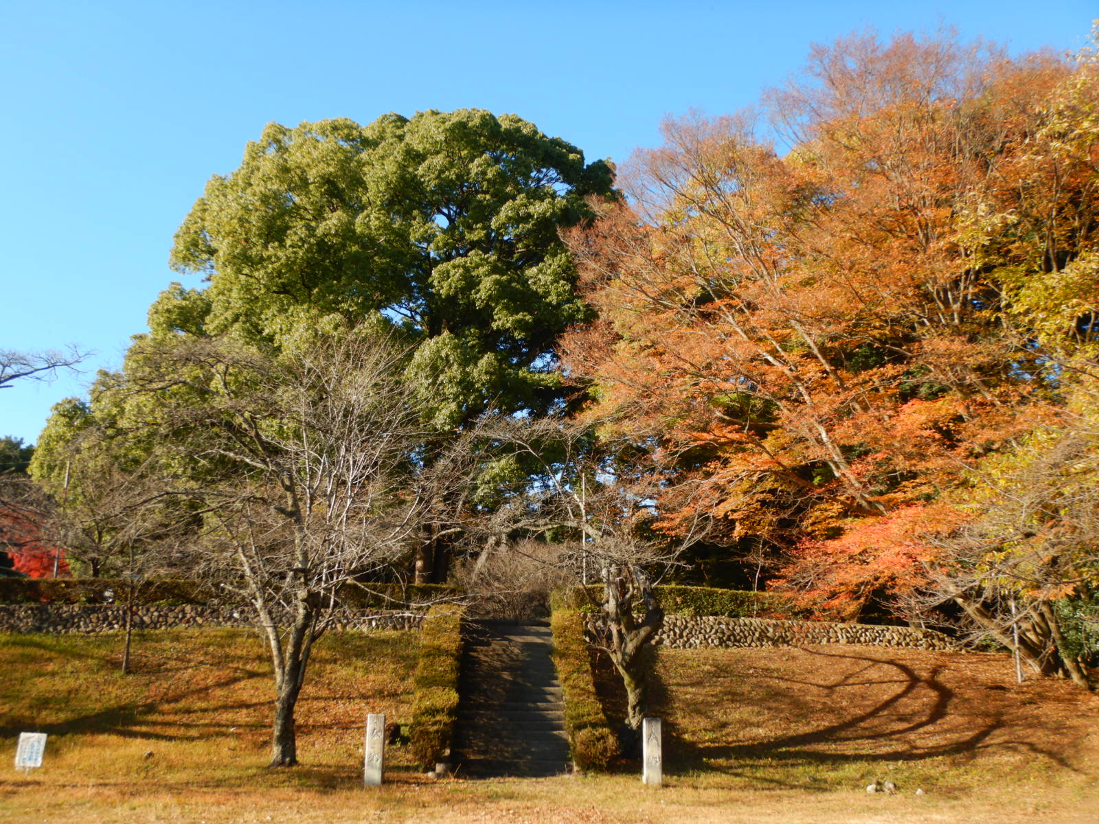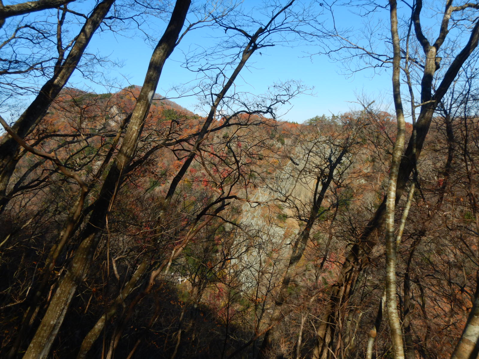 持方の駐車場を10時過ぎに出発しました。他に車は無く登山者は私だけでした。気温は5℃くらいでしょうか?、10時を過ぎているのに日陰では霜が残っていました。標高は約500mですが山ではこんなものなのでしょう。大円地越のケヤキ林がゲートのように立っている中を登って行きます。尾根に出ると冷たい風が吹いていました。電波塔のある男体山が見えました。ブナの大木の下を下ります。切れ落ちた狭い谷にいくらかの紅葉が見えました。男体山の南面はいたるところが断崖です。所々にやせ尾根があり注意は必要ですが、南側に展望が広がります。富士山は見えるのか、山頂に着いたのは11時過ぎですから期待はしていませんでした。いや、山頂に着く前から気になって南西方向を何度も眺めました。小さい三角山の右上の辺りに何か有るようでもあり無いようでもあり、目を凝らしても分かりませんでした。冬でも9時頃までなら見えることが多いのですが、太陽が上から照らすような時間帯は、余程条件がよくないと見えないようです。山頂は冷たい風が吹いていました。筑波山、奥久慈の山なみをのんびりと眺めていたい所ですが冷たい風が下山を促します。山頂から来た道を戻りました。大円地越まで戻ると、大円地へ下る道に紅葉が残っているのが目に入りました。100mほど下ってみると奥久慈に多いモミジ谷でした。もう少し先はどうなっているのか知りたいところでしたが私が下るのは反対側、登り返すのが大変になるので引き返しました。山頂で3人、下山途中で4人に会っただけの静かな山でした。持方に戻ると車が2台、バイクが1台増えていました。早朝は寒いので皆さんゆっくりなようですが、低山といっても日が傾くとすぐに寒さが襲ってきます。