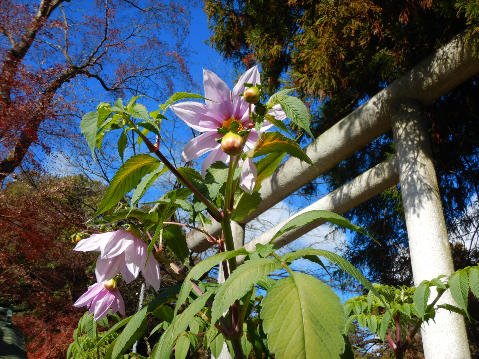 今朝の栃木県北東部の当地は氷点下3℃でした。昨日もその前の日も氷点で、晴れれば放射冷却で内陸部は冷え込みます。冬型の気圧配置になると強風が吹き荒れて体感温度はかなり下がります。東京都心もこの冬の最低気温になったようで今朝は2.5℃になったそうですが、東京でも都心から離れればかなり冷え込んでいるはずです。神社の皇帝ダリアが咲いていました。この季節、風のある日は神社に限ります。神社の森が北風や北西の風を遮ってくれます。朝は毎日氷点下の気温で何度も霜が降りているので、他の皇帝ダリアはほとんど終わっています。おそらくここは夫婦杉という大木の庇が霜から守っているのでしょう。ニシキギ、ジシバリ、キツネノマゴ、北風の当たらない陽だまりではまだ花が見られます。宇都宮地方気象台では7日夜に初雪が降ったとの発表がありました。私の住む地域でも雪が降った可能性はありますが、まだ見てはいません。寒くなったとは言ってもまだ冬の入り口です。