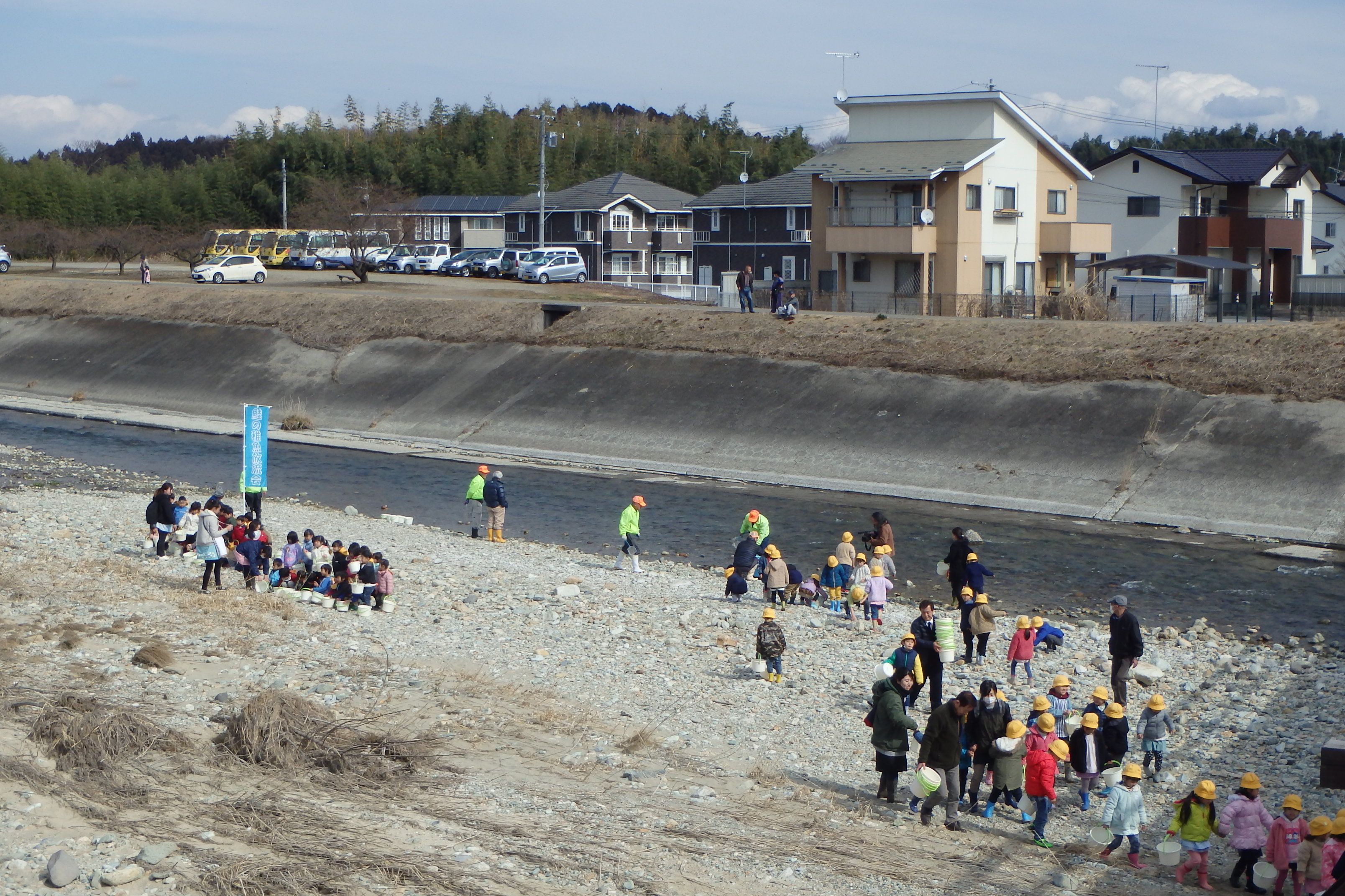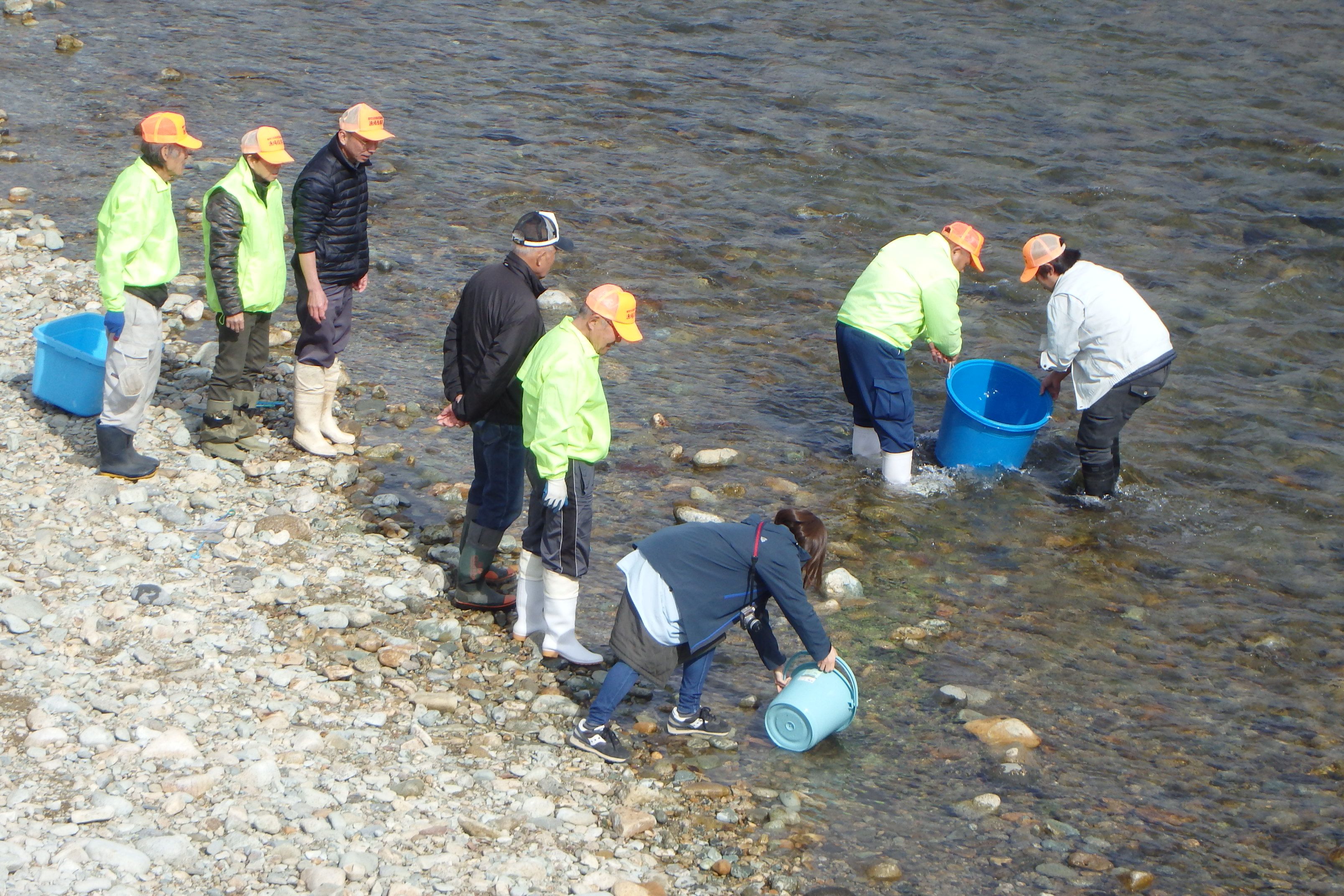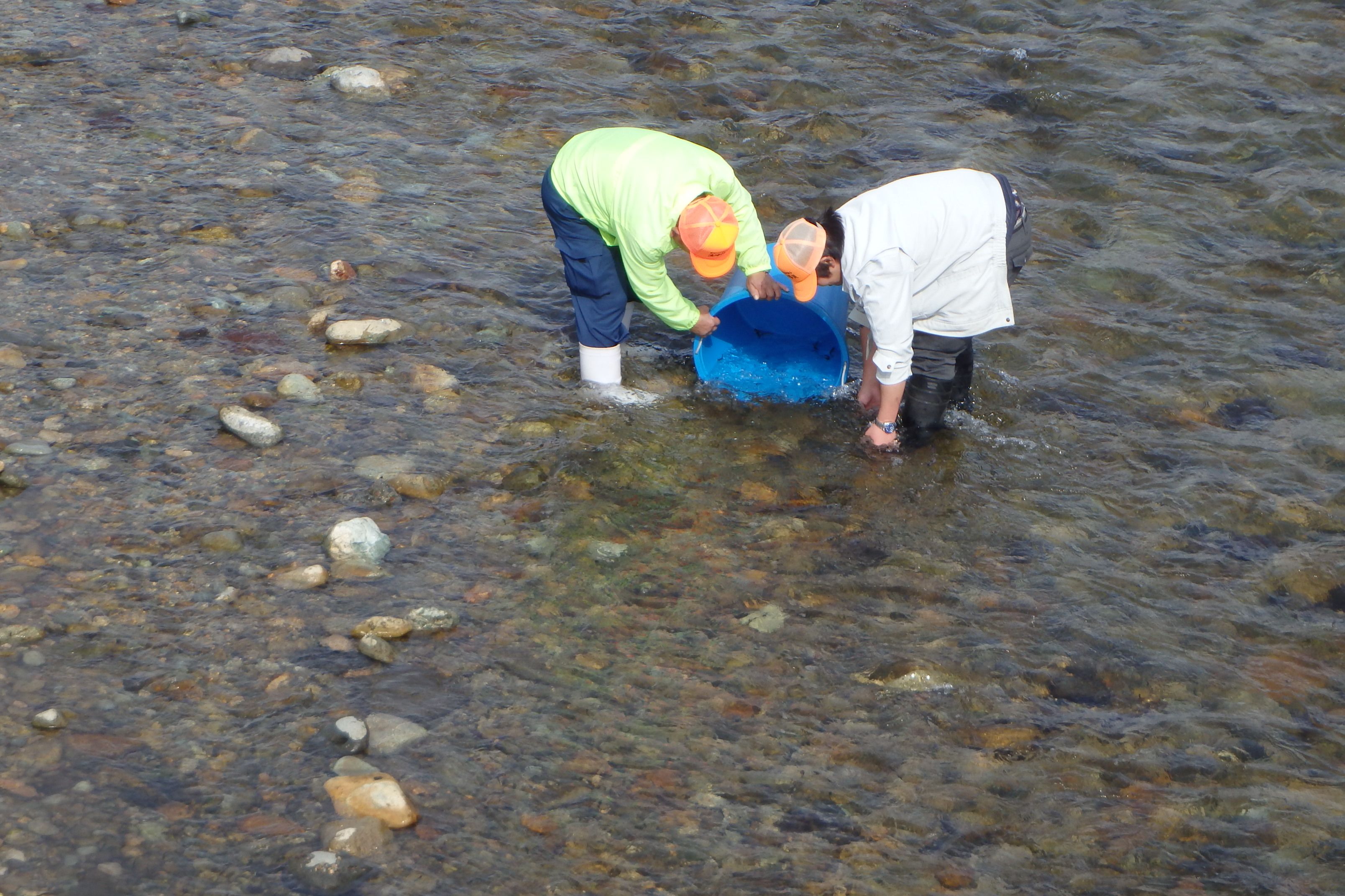 ウオーキングに出掛けたら鮭の稚魚放流に出くわしました。