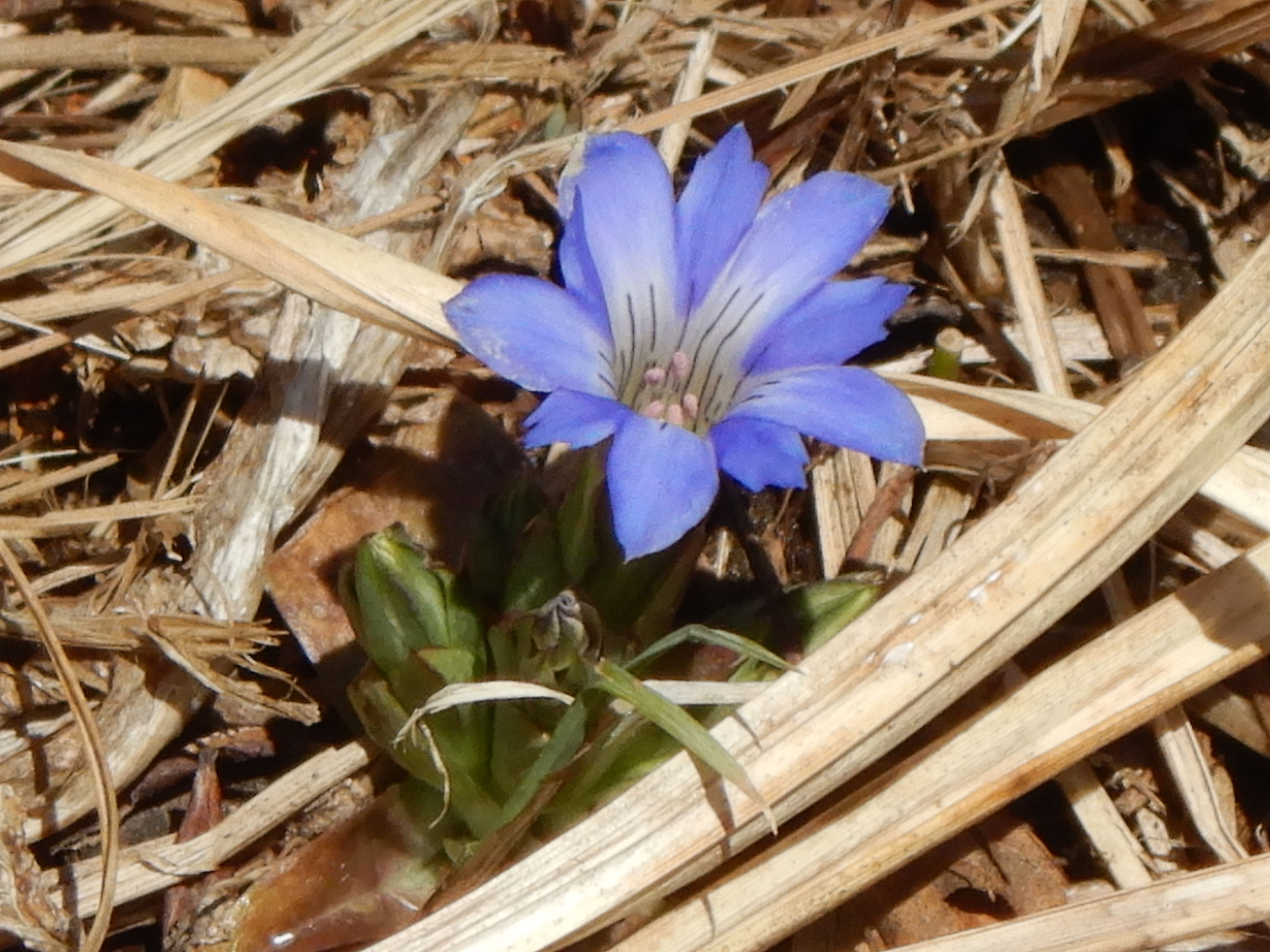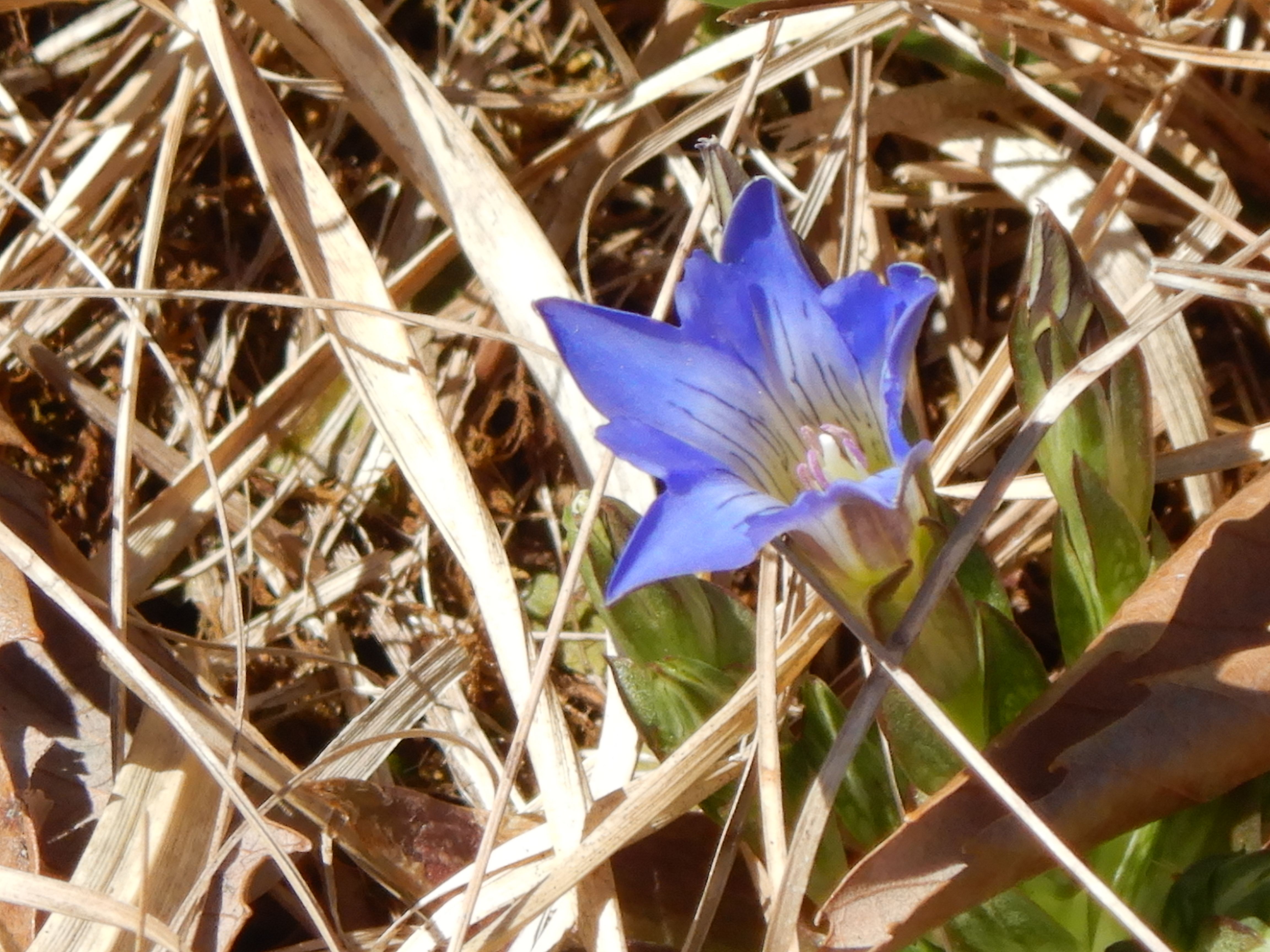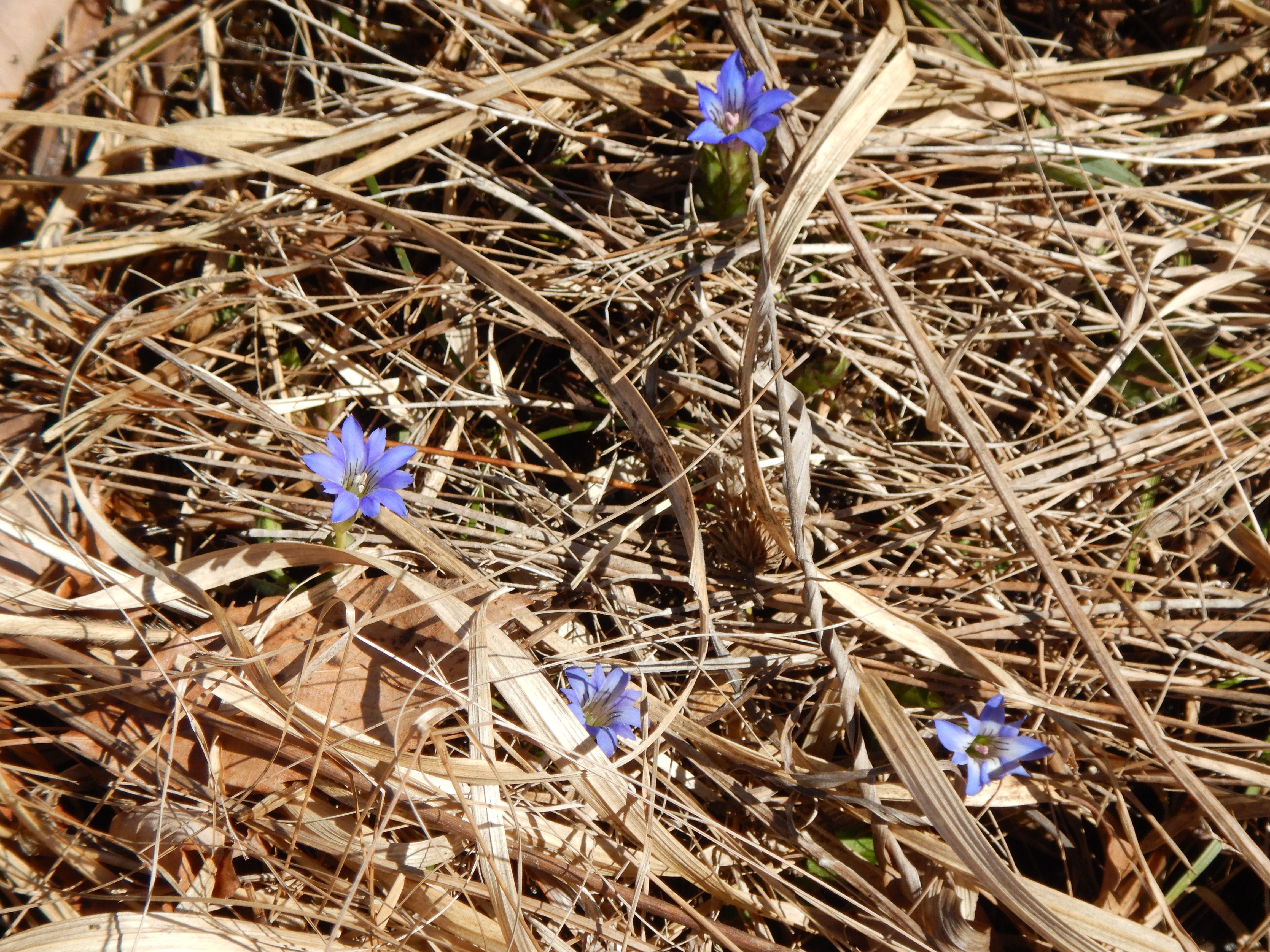 足元をよく見ると、枯草の中に小さなハルリンドウが咲いていました。