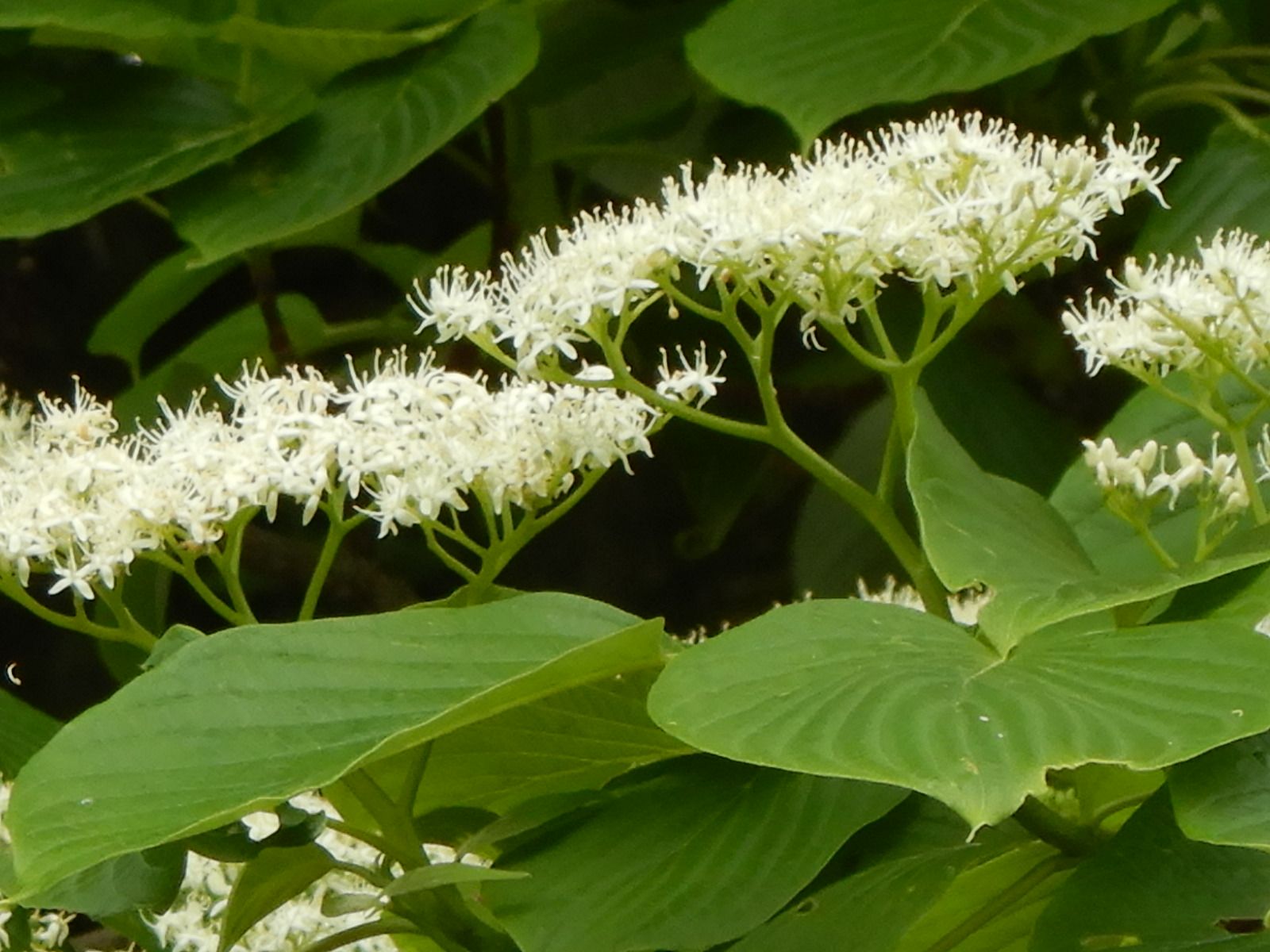 緑の中にミズキの白い花が咲いています。