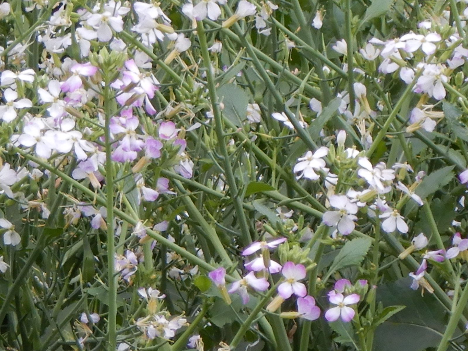畑の中の収穫されなかった大根、白花だとばかり思っていましたが、時間の経過なのか花びらに色がついています。