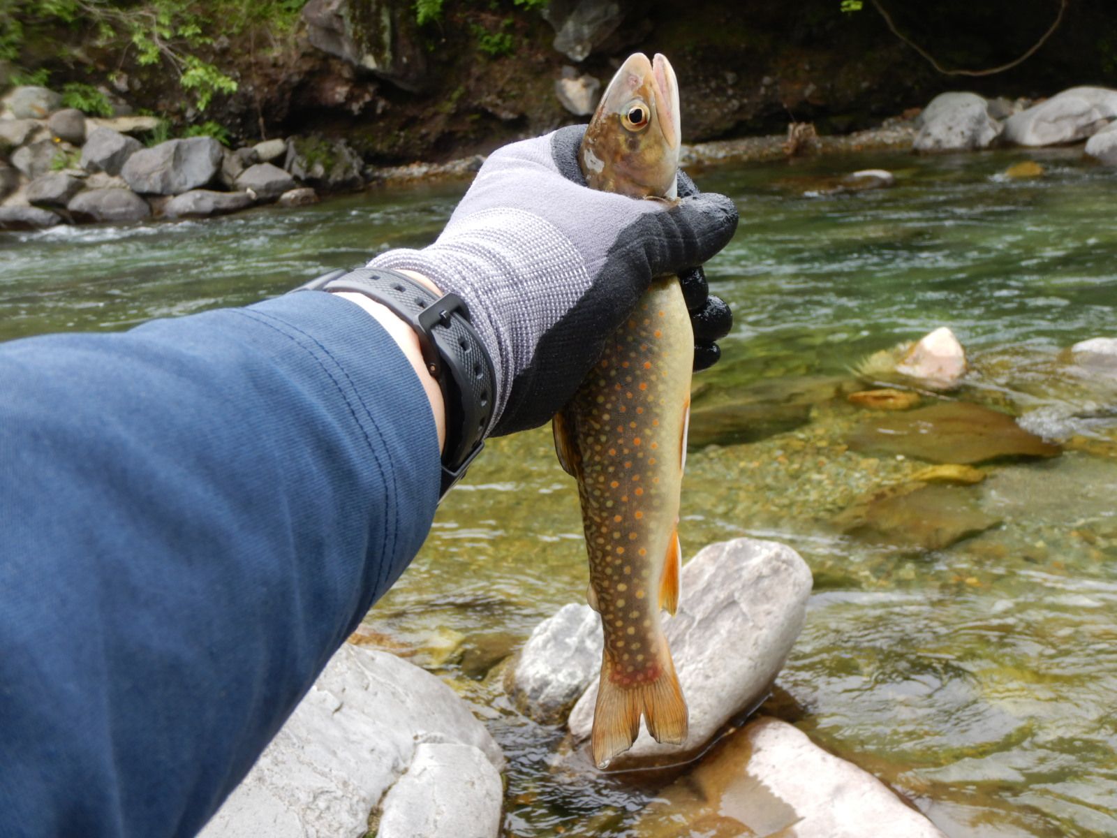 餌を川虫からブドウ虫に替えて、対岸のポイントに振り込むとイワナがかかりました。
