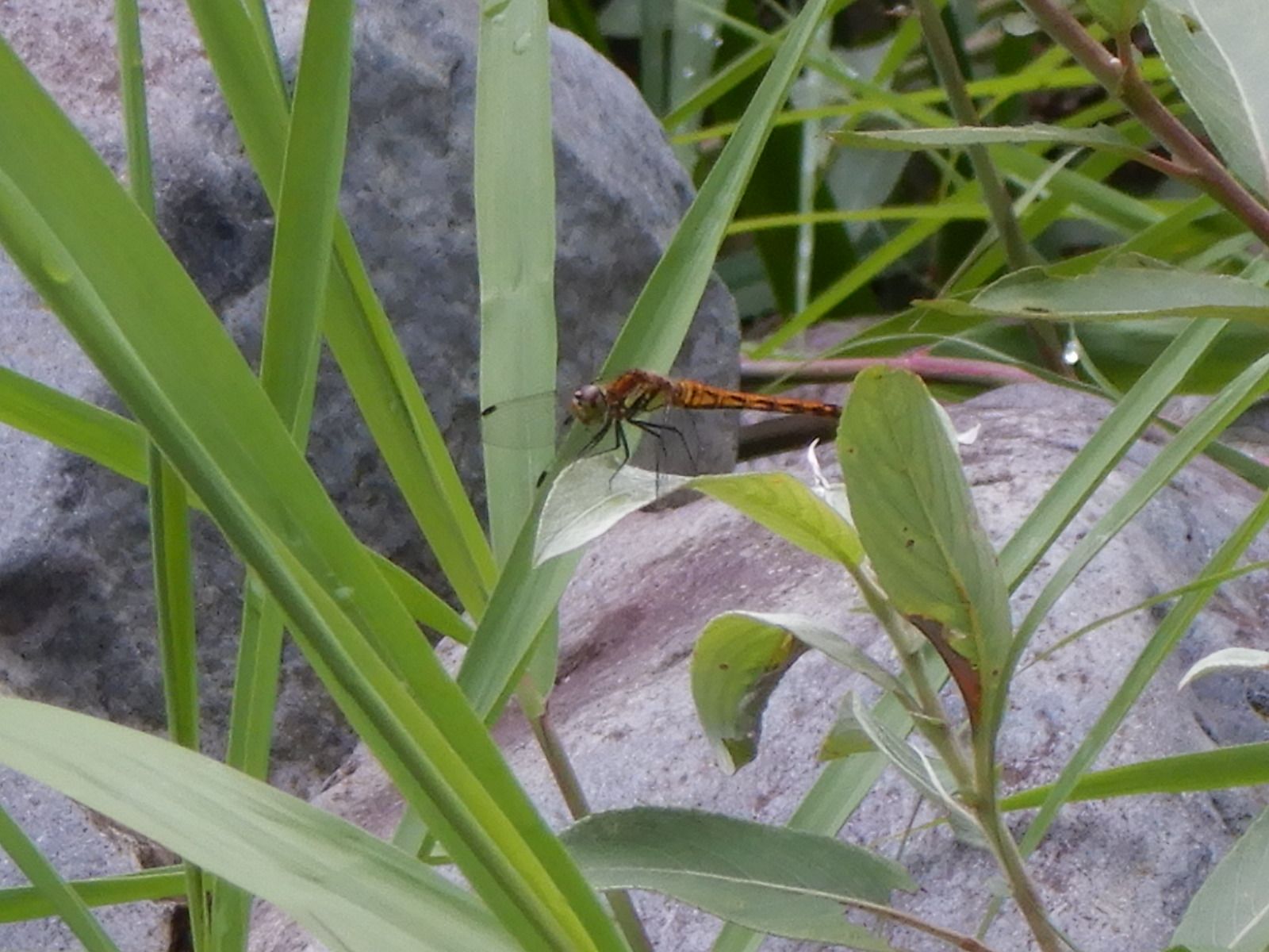 赤トンボが飛んできて竿に止まろうとしますが滑って止まれず、