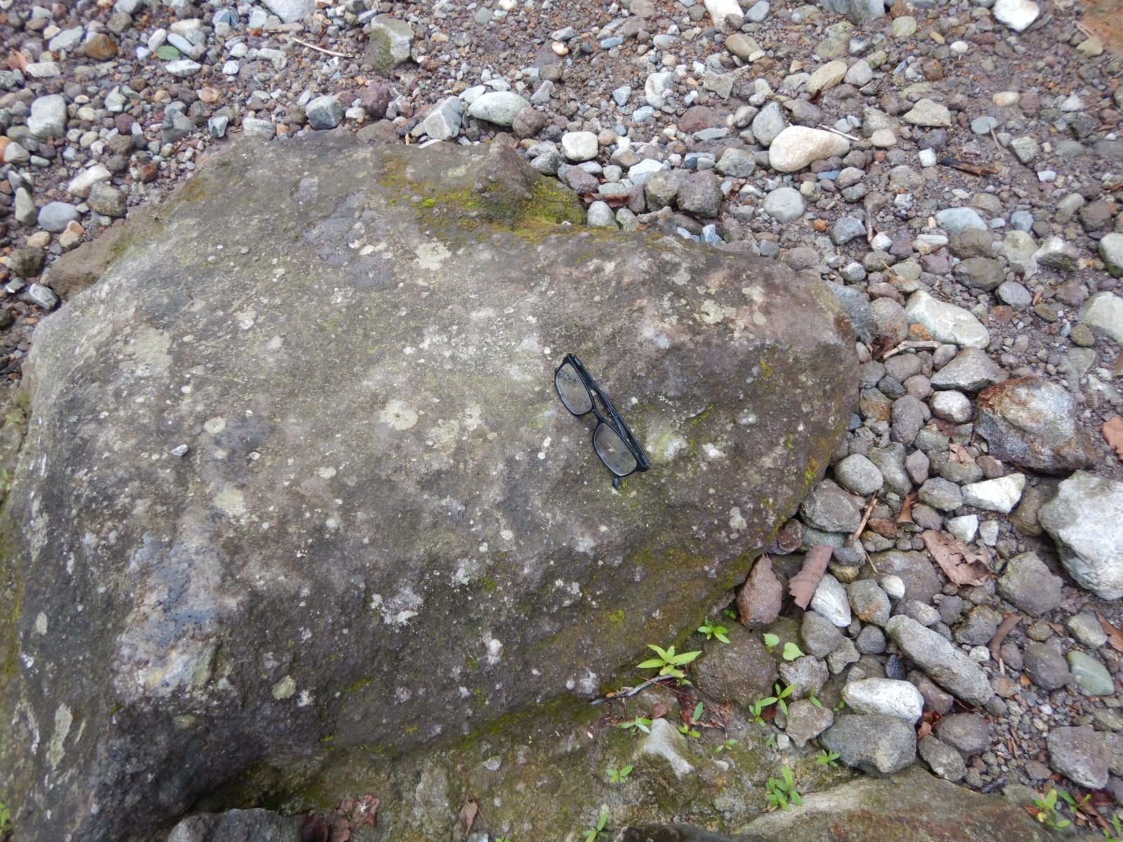 下流に向かう途中、メガネを見つけました。どうしてこんなところに?と、横目で見ながら歩いていると岩に躓いて川岸に転んでしまいました。一匹も釣っていないのに下半身がずぶ濡れです。いや、上半身も左側が濡れました。