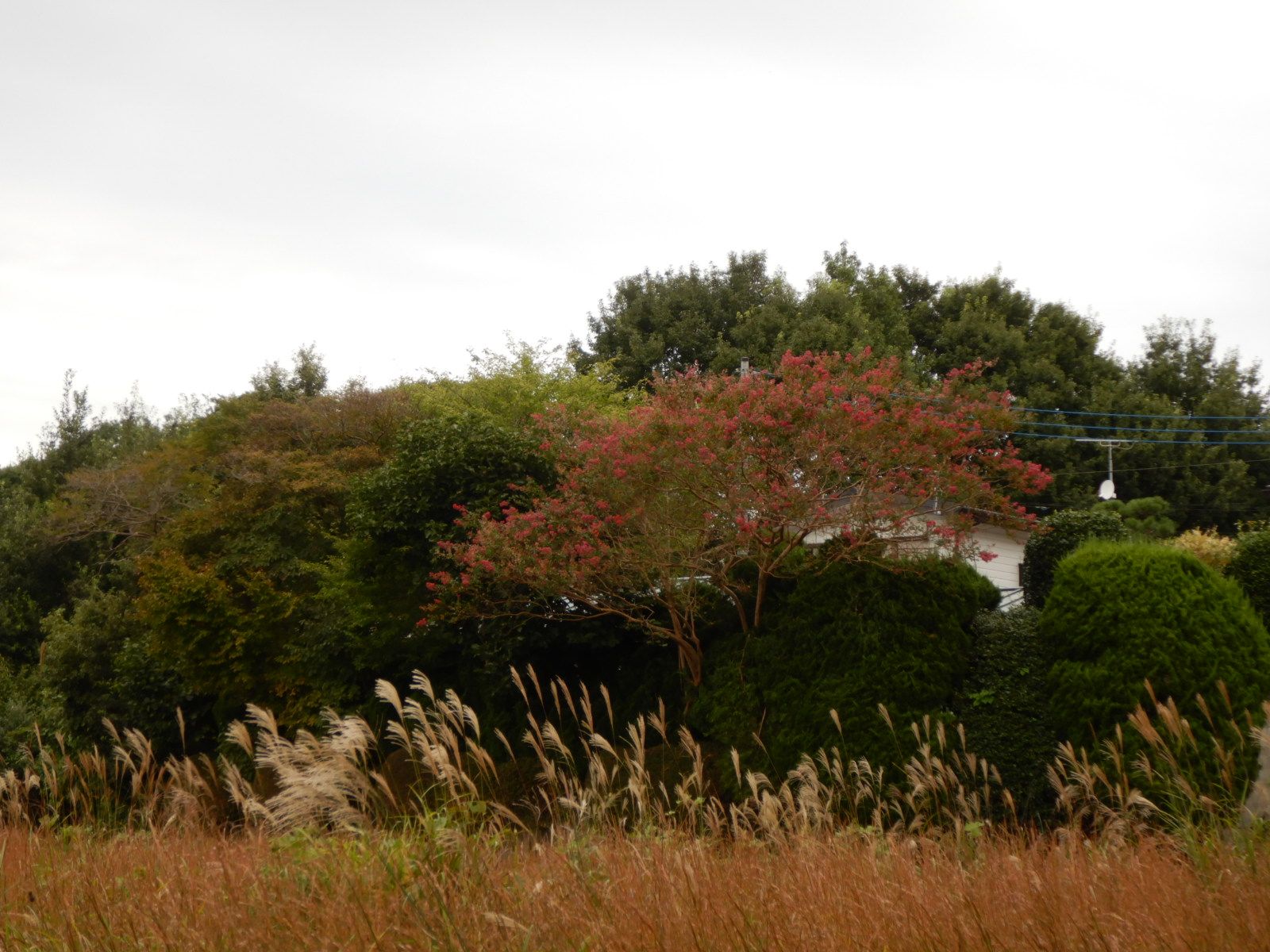 ススキとサルスベリが同じ空の下に咲いています。