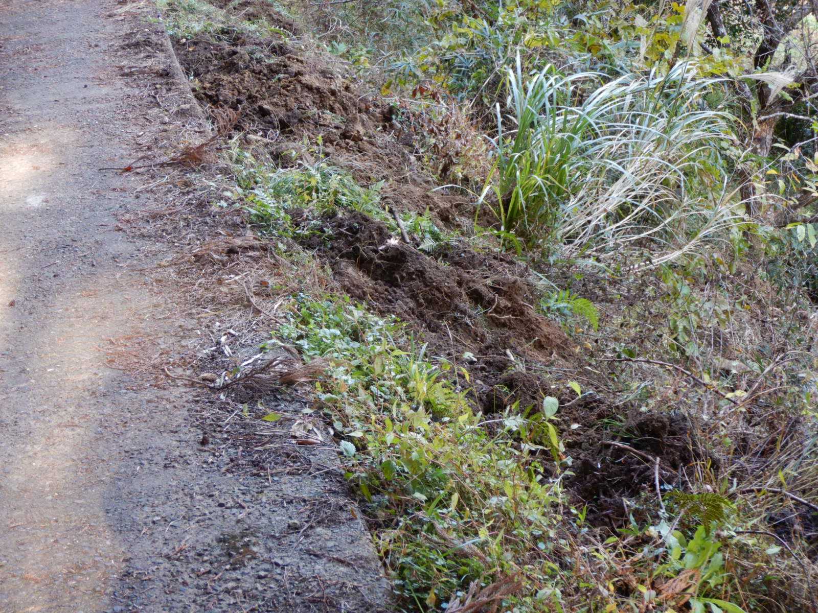 道端を掘り起こしているのはイノシシの仕業のようです。