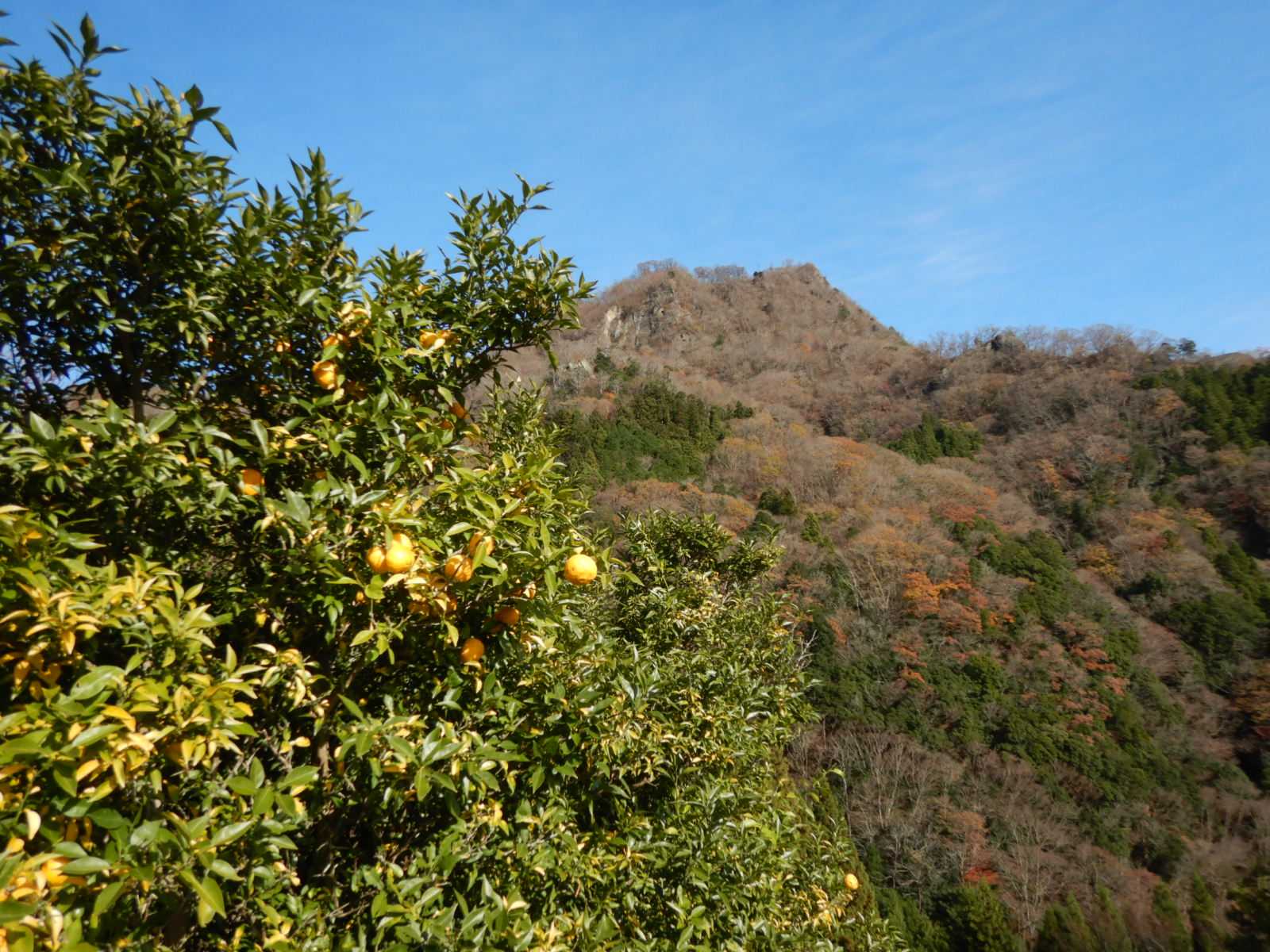 柚子の木越しに下って来た山を見上げました。