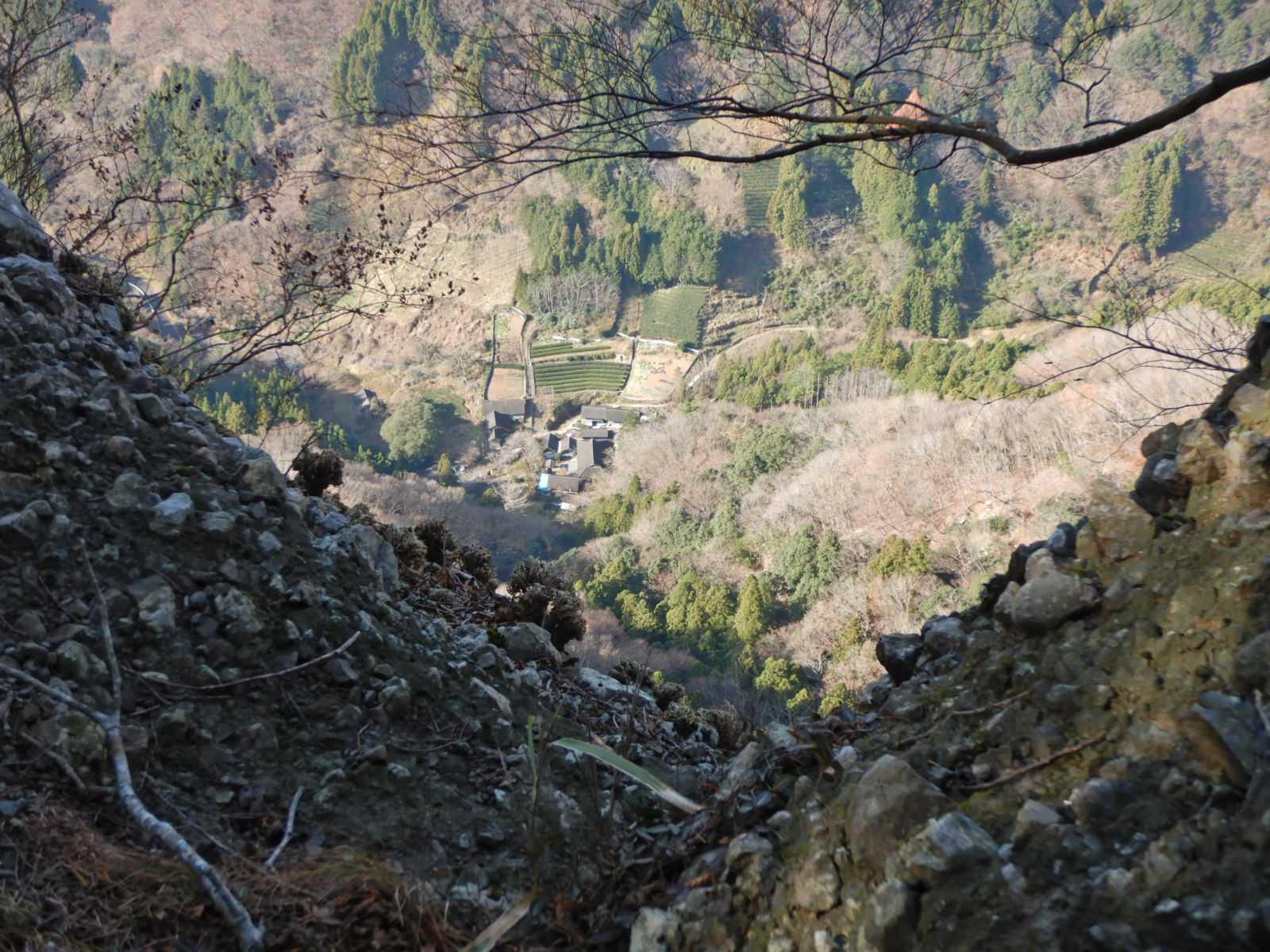 断崖に近づいてのぞき込むと、登り始めの大円地の家が眼下に小さく見えました。