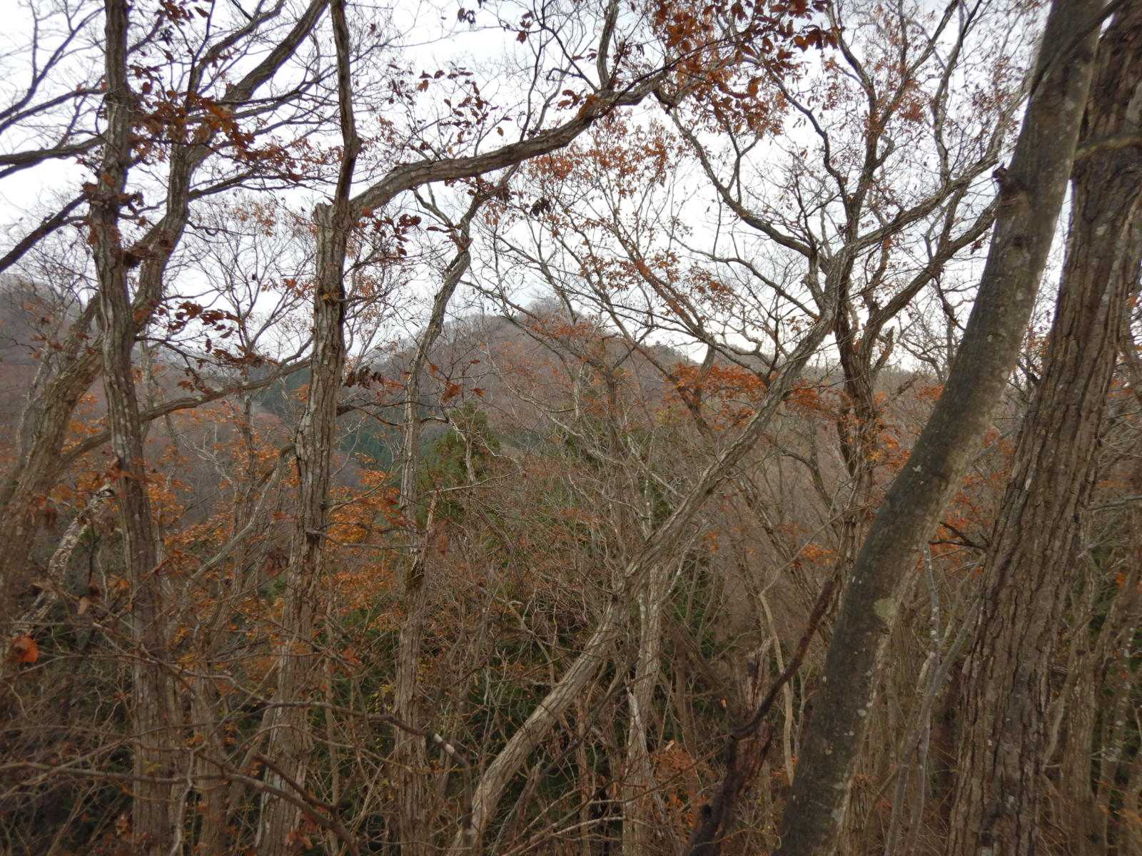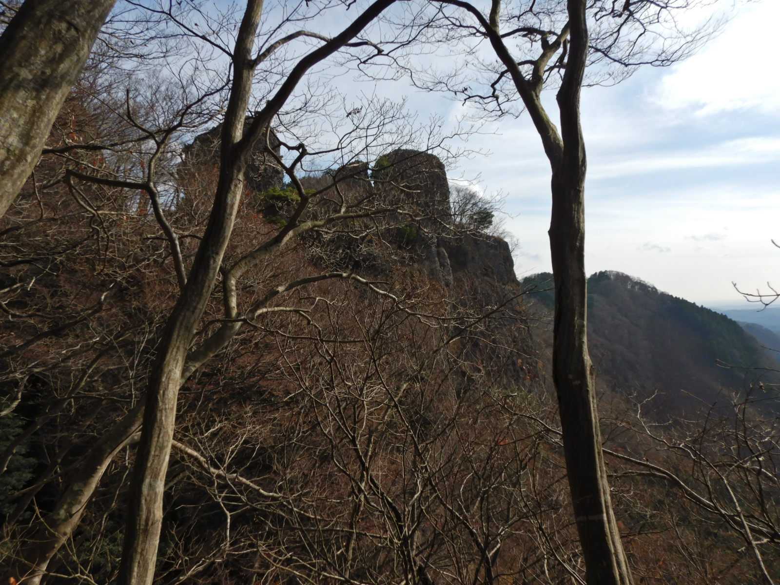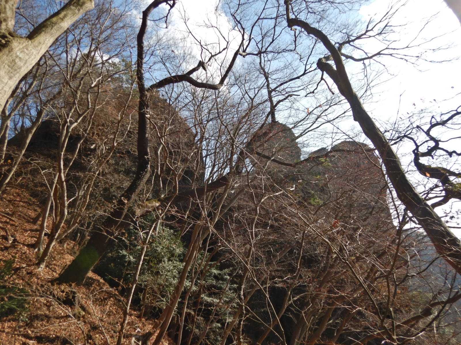 ちょうど12時だったので、風の無い雑木林の中で入道岩を眺めながら昼食にしました。