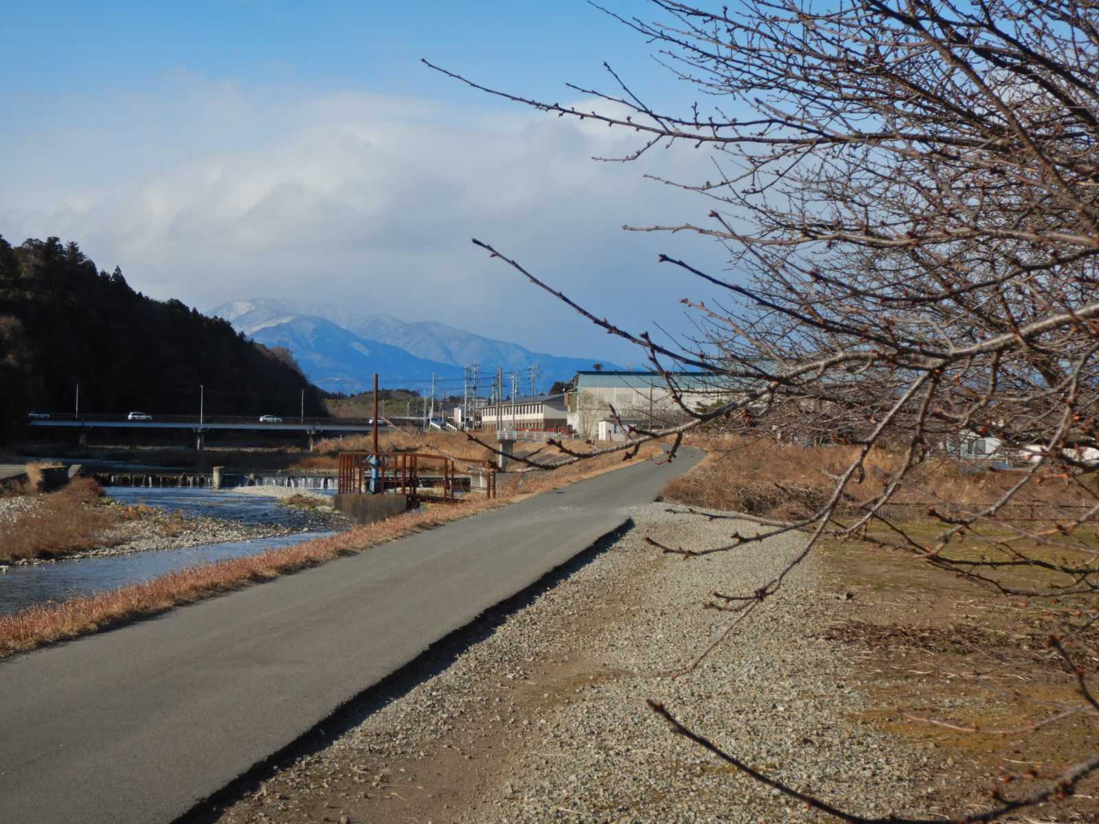 川の上流の雪山は塩原山塊です。