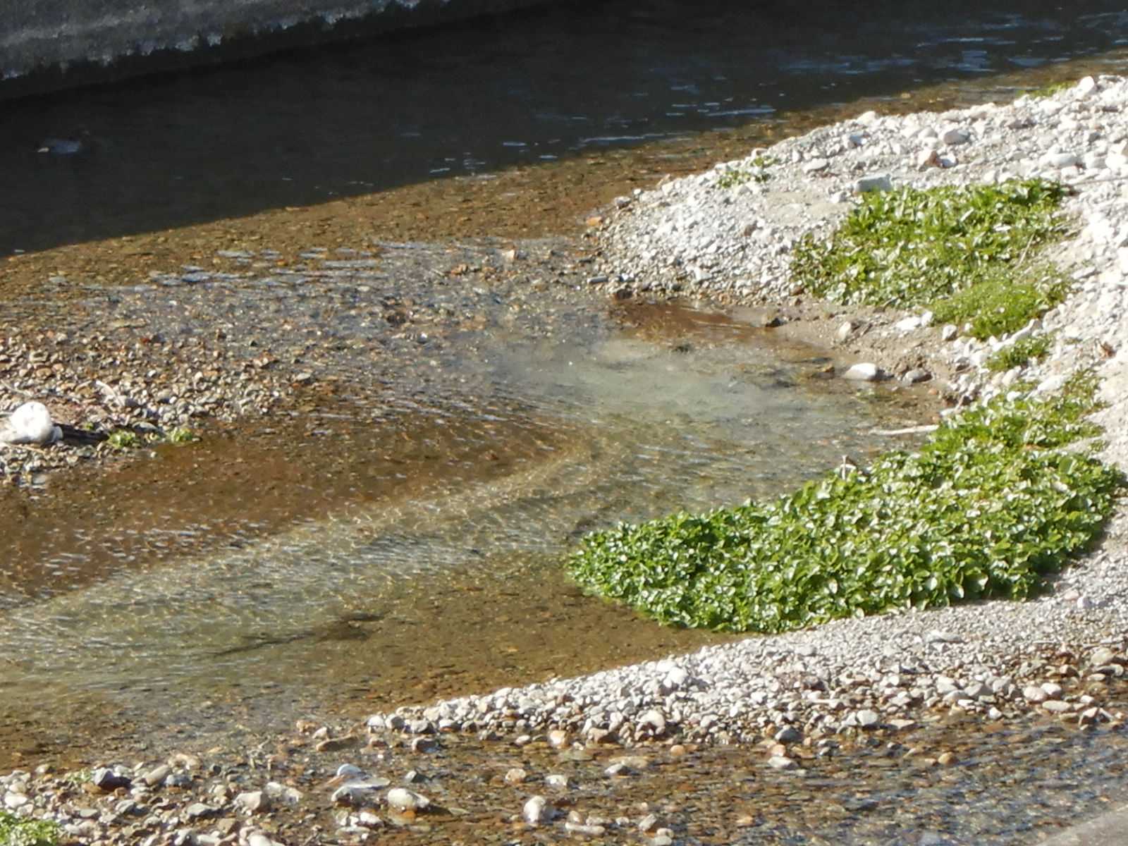 川沿いのあちこちで見られるクレソンの緑、河原にあがっているものもあり水位の減少したのが分かります。