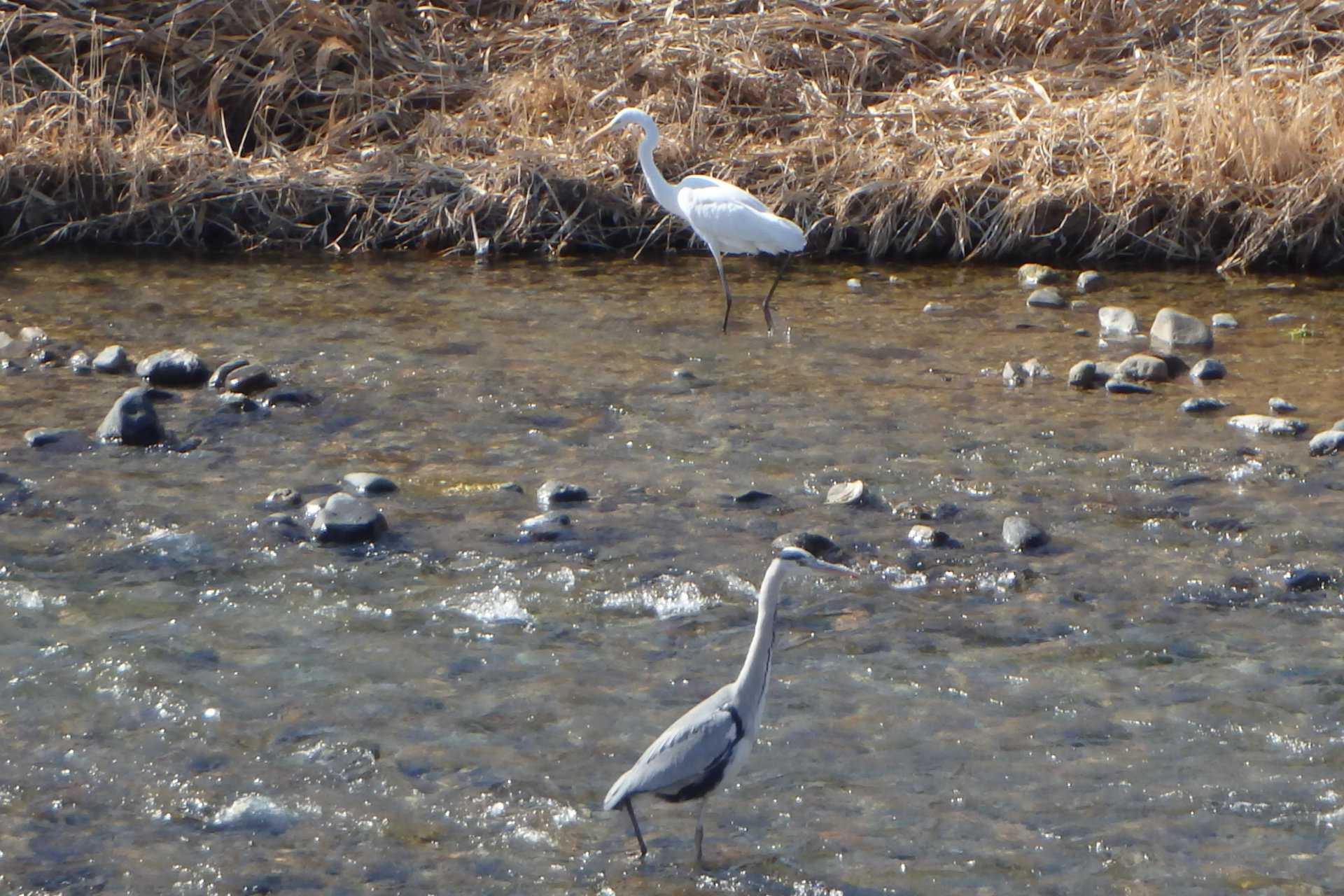 シラサギとアオサギがソーシャルデスタンスをとっています。