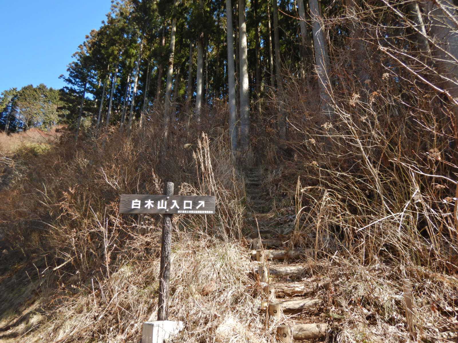 持方まで下り次は白木山、この地域では男体山が一番高く二番目が白木山、二つの山を八の字に回ります。檜の林を過ぎると山頂まで真っ直ぐに伸びたロープが現れます。