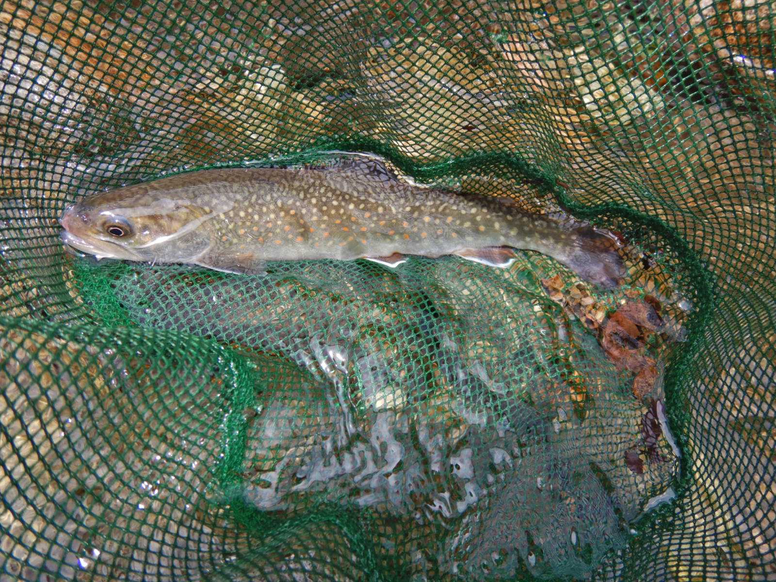 沈黙の時間が長くつづいたので川虫を取って流すとイワナが掛かりました。