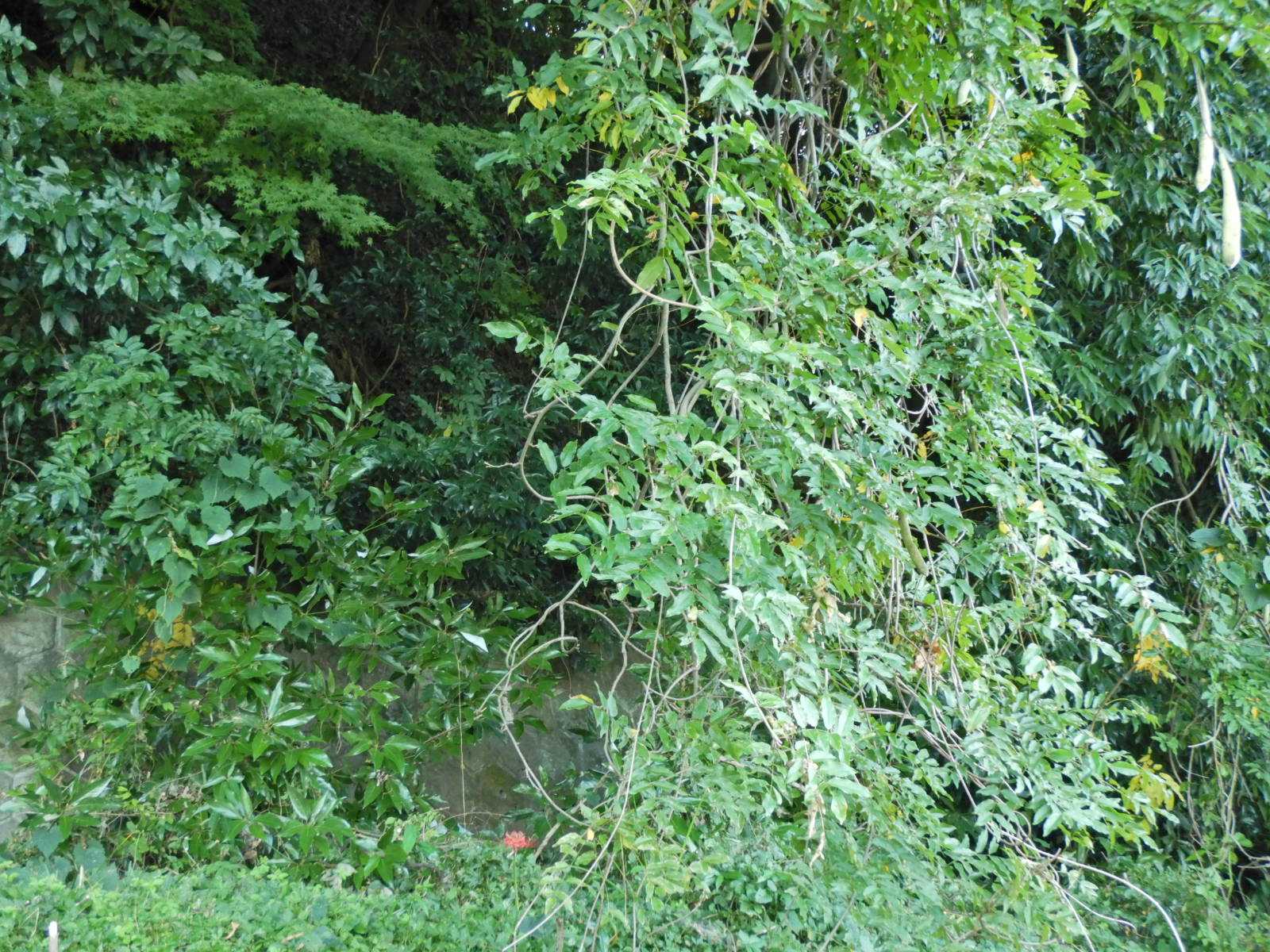斜面の下、木々の枝や弦が傘のようになっている下に赤い花、