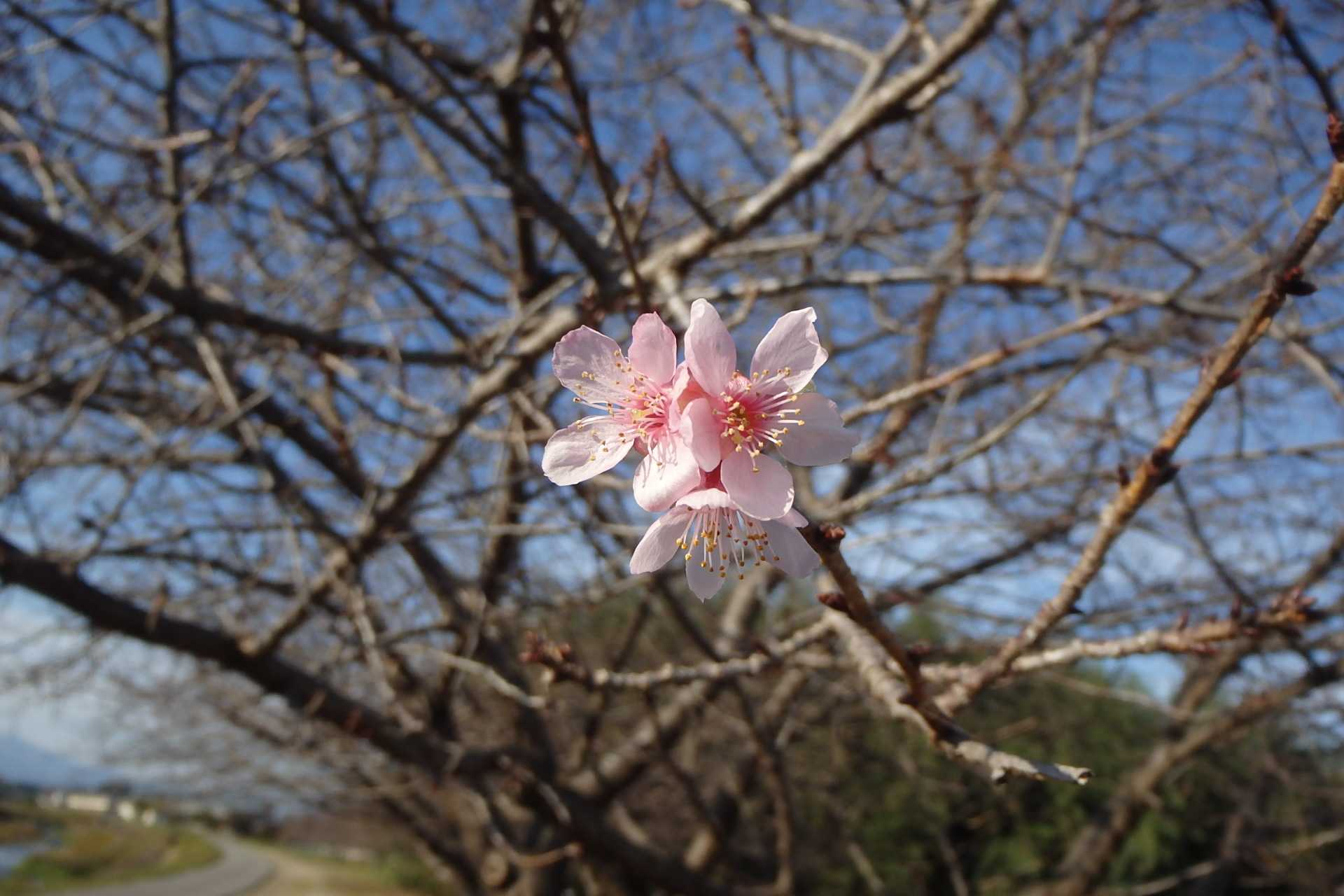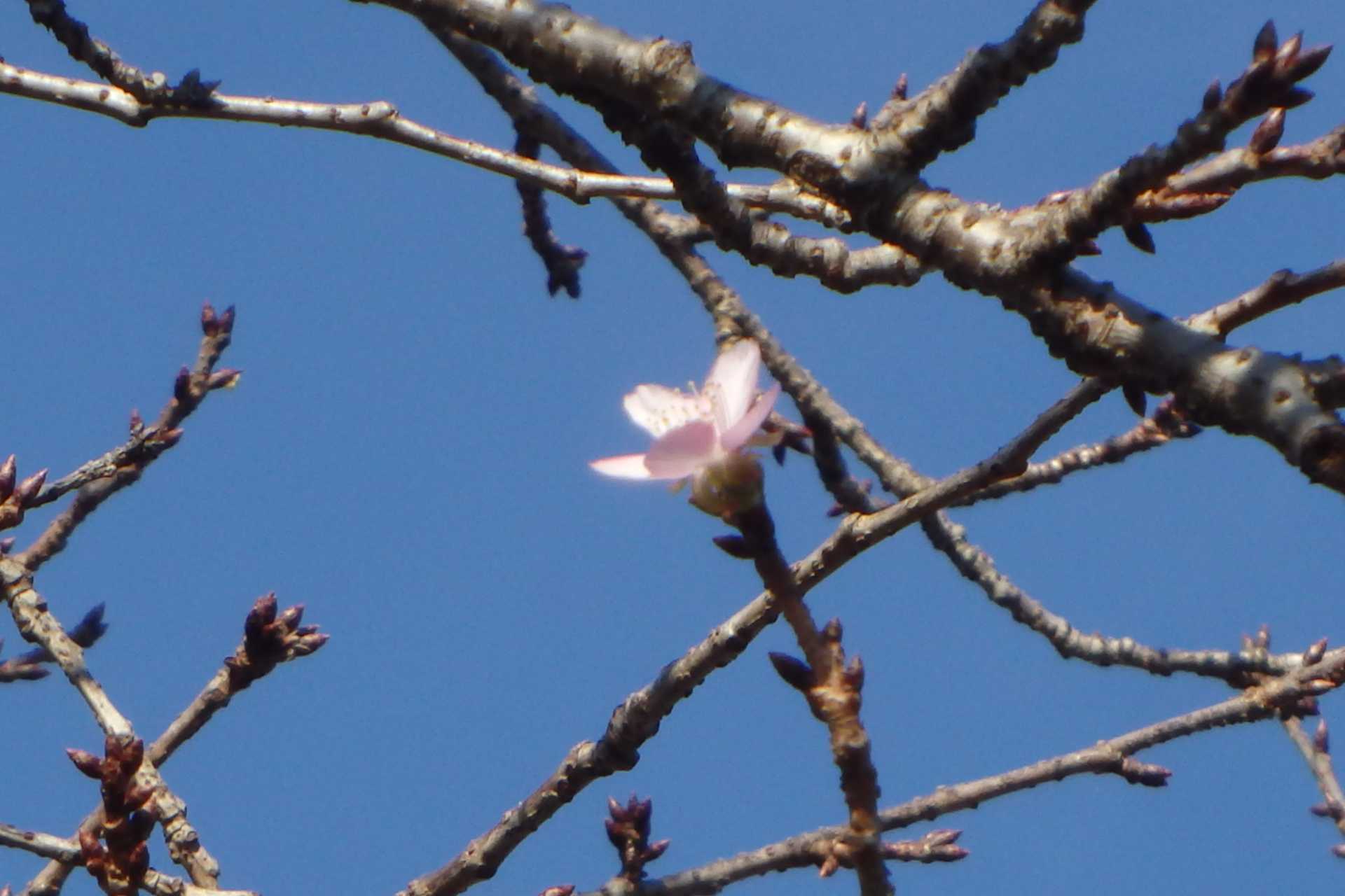 先日、川沿いの河津桜に一輪の花が咲いているのを見つけましたが、今日は別の木にも花を見つけました。