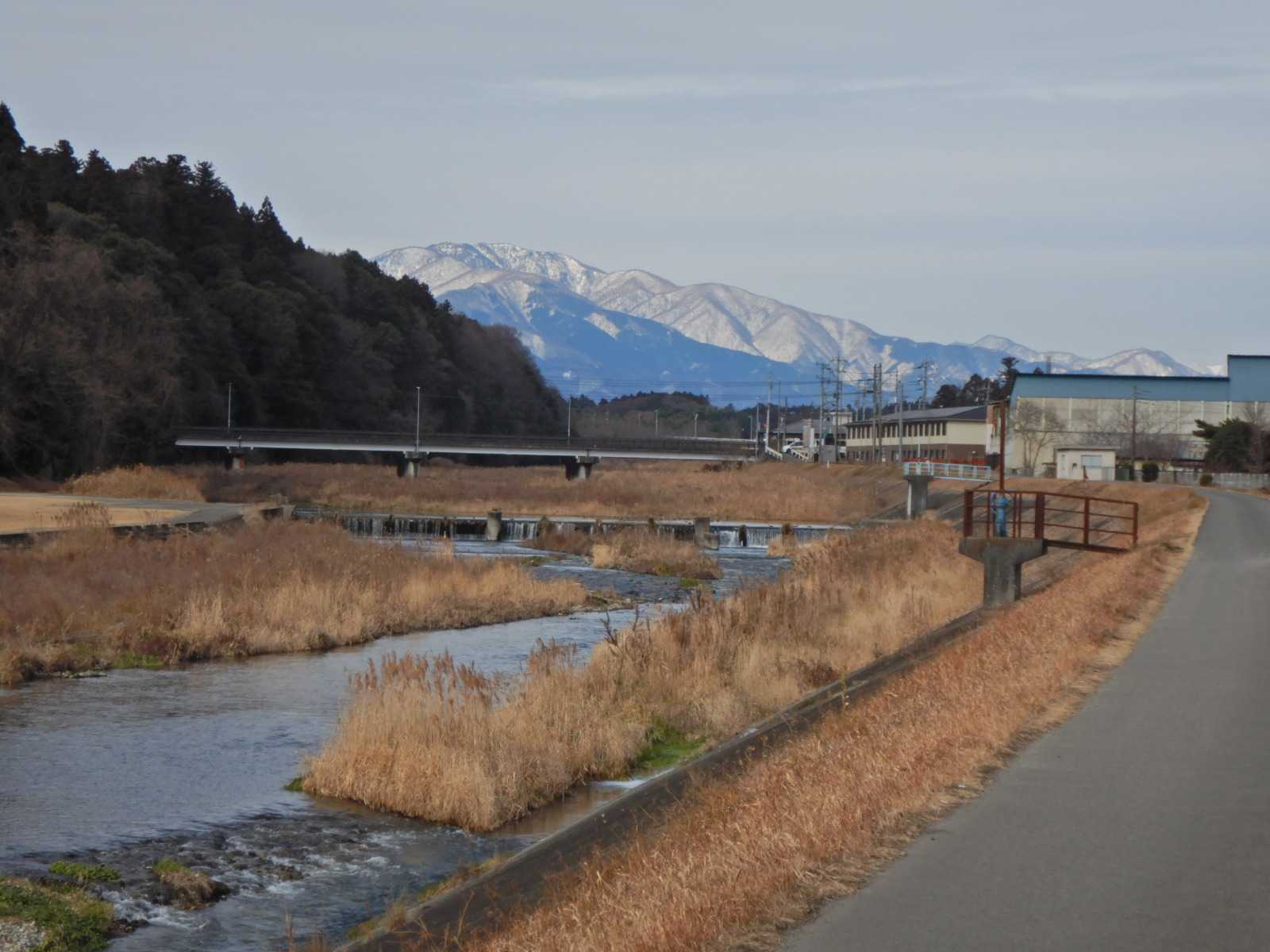川の上流の塩原山塊、今日は風が無いので助かります。