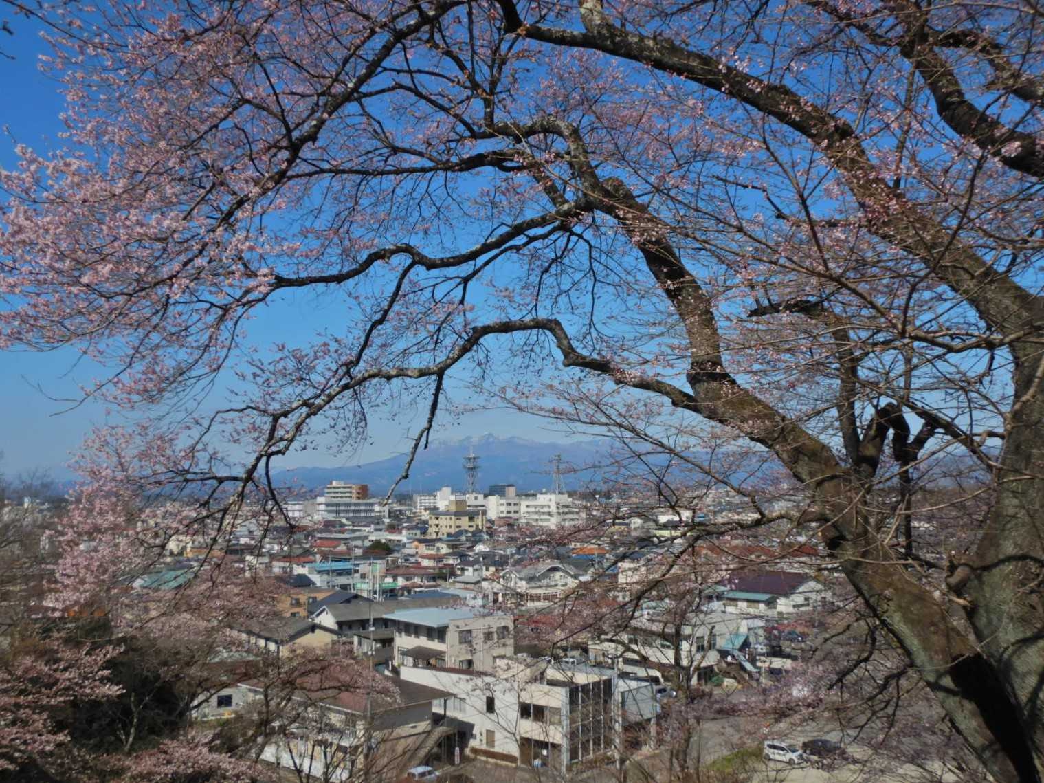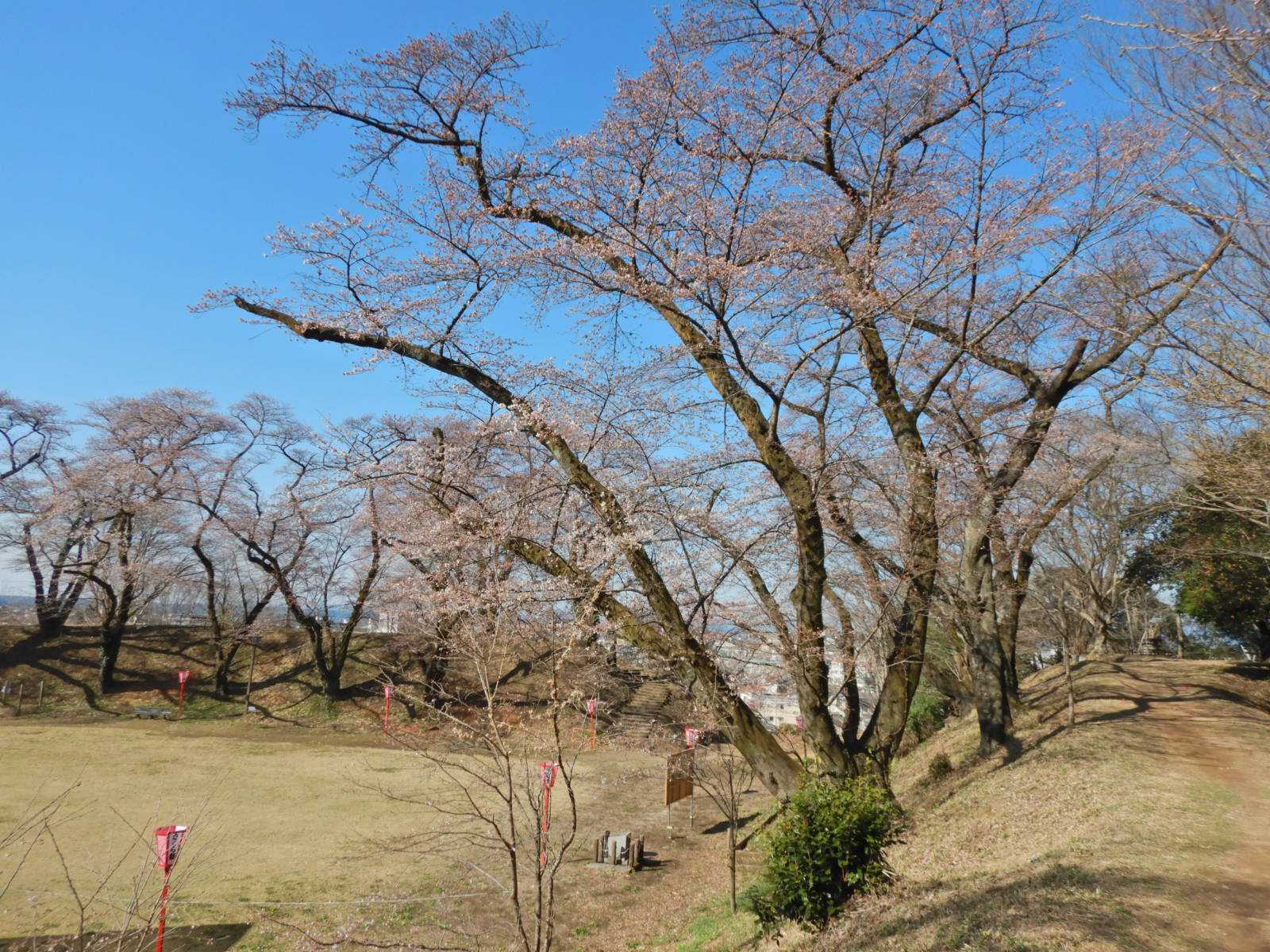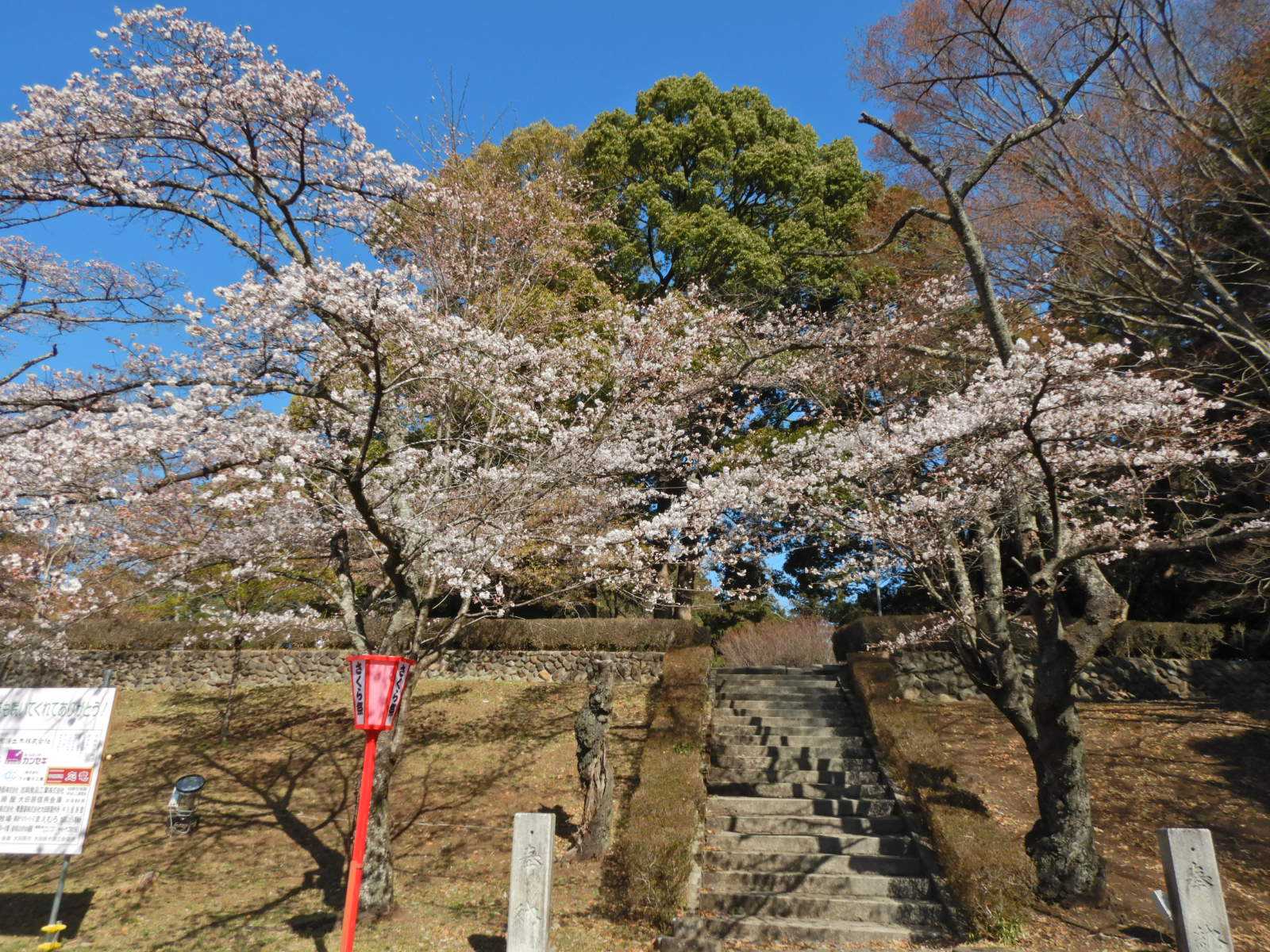 城山の隣の神社の桜は、北風が当たらないせいか開花が進んでいました。