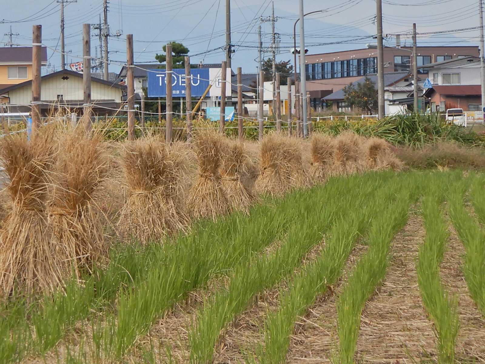 刈り取りの終わった田んぼですが、最近では見かけることの少ない稲藁が干してありました。