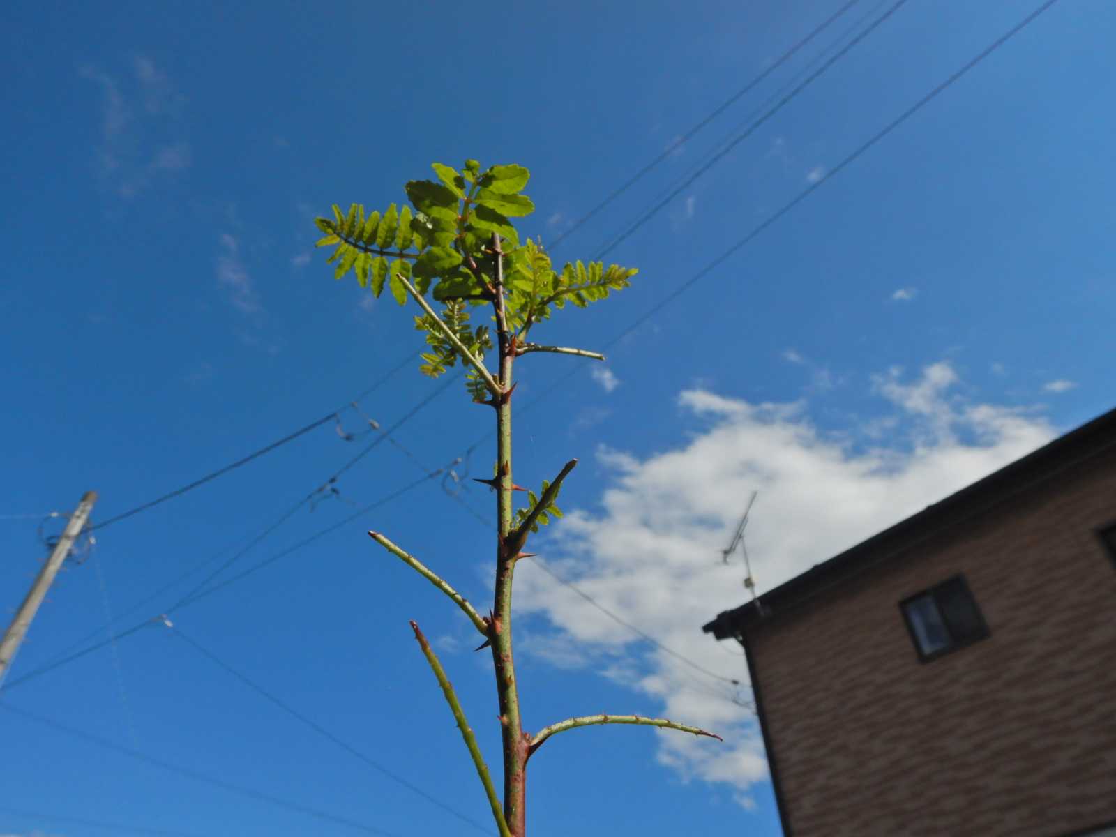 アゲハ蝶の幼虫に葉を食べられてしまった高さ80㎝ほどの山椒の苗木ですが、上の方に葉が出てきました。