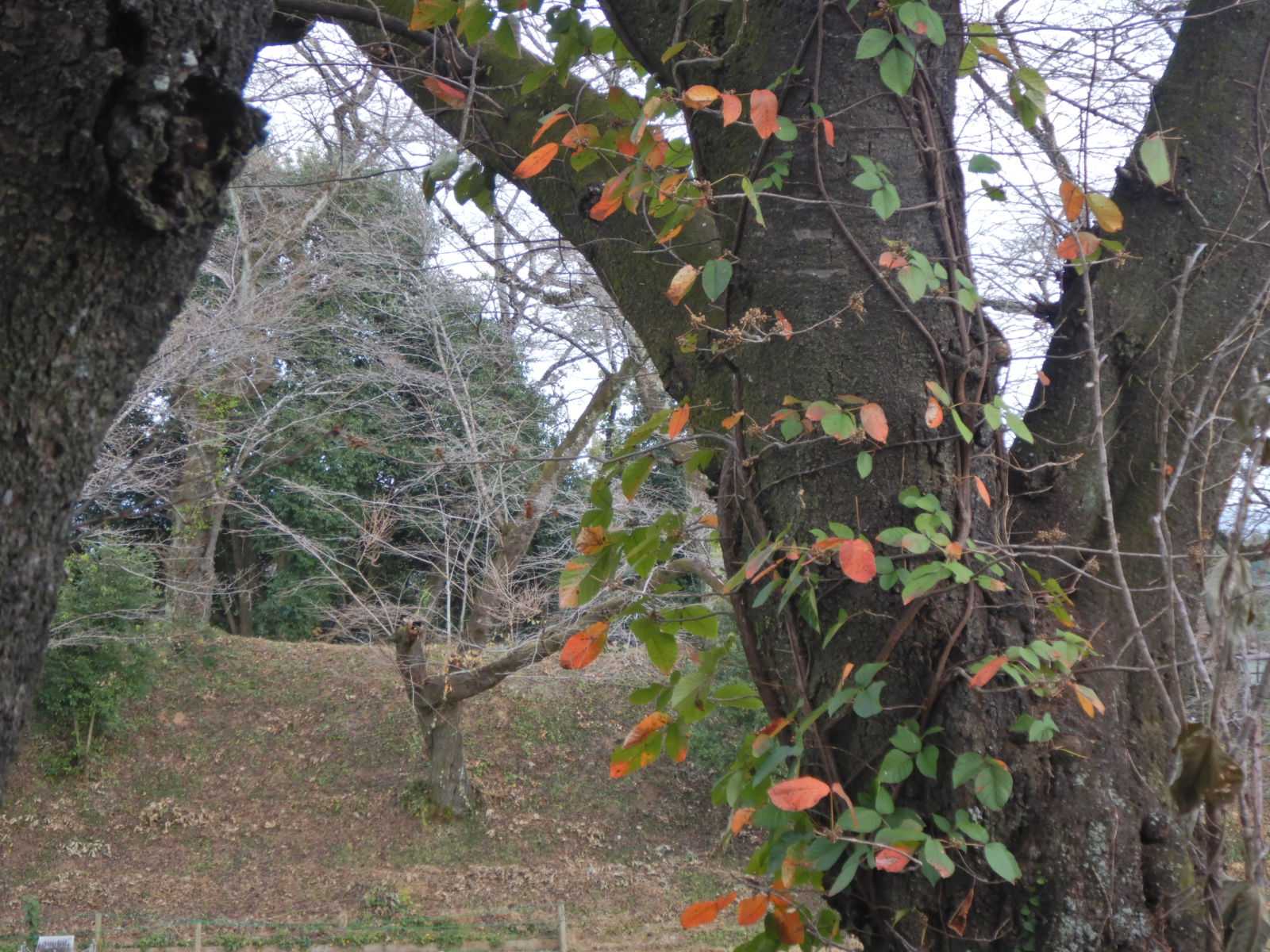 すべて葉を落とした桜に蔦の葉が色づきはじめていました。