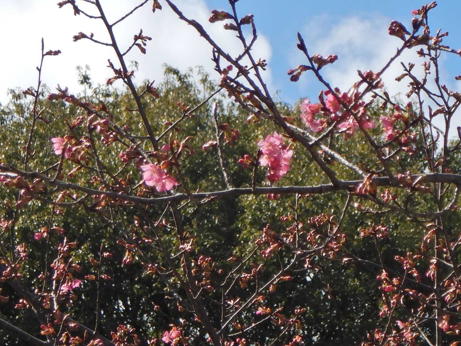 神社の河津桜の中で一番早く咲くこの1本も足踏み状態です。