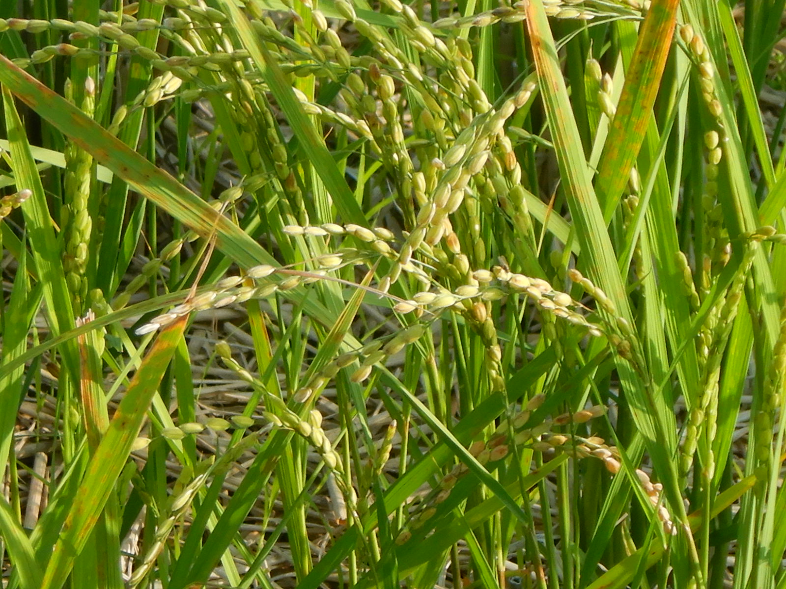 刈り取られた稲株から出てきた実っているように見えるひこばえ、でもおそらく稲穂の中味は空でしょう。