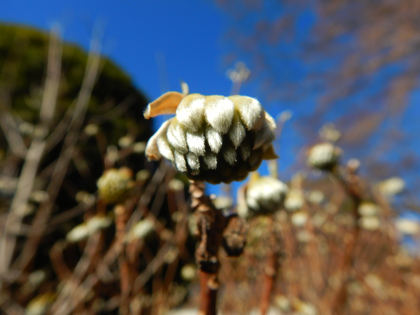 ミツマタの冬の姿、綿毛のようなもので寒さから守っているようです。