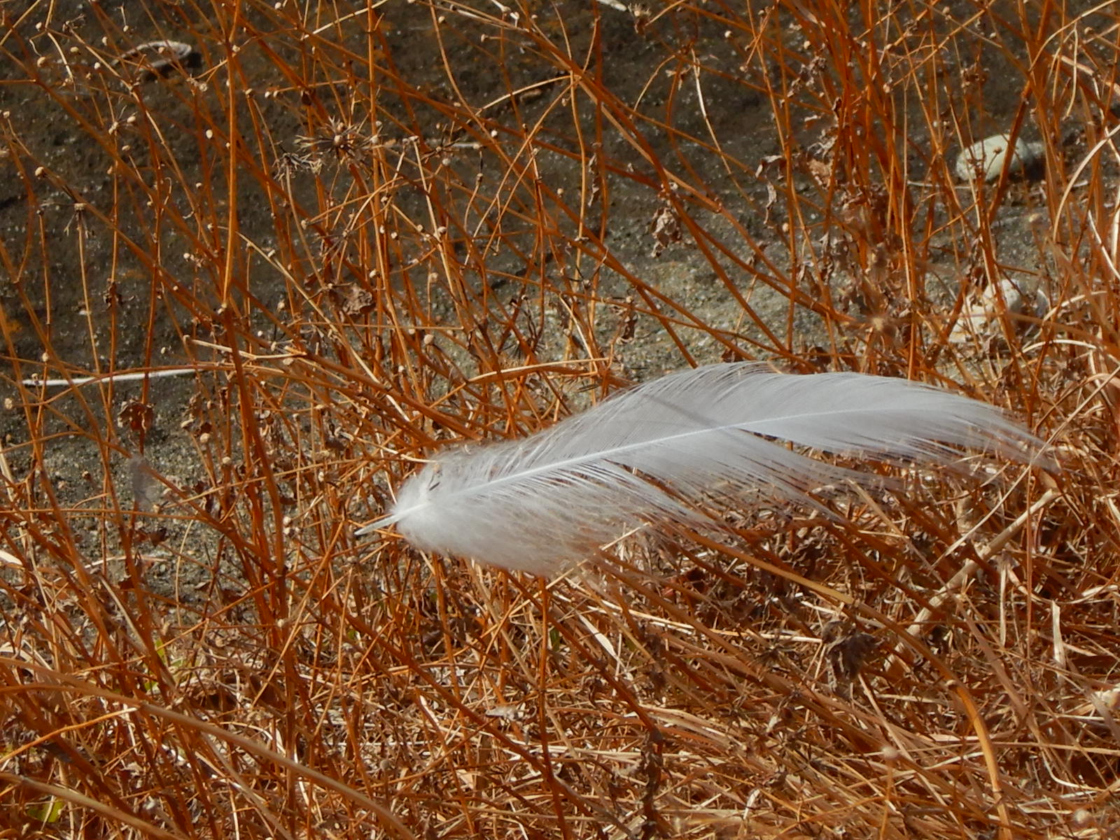 シラサギの羽根でしょうか、枯草にひっかかっていました。