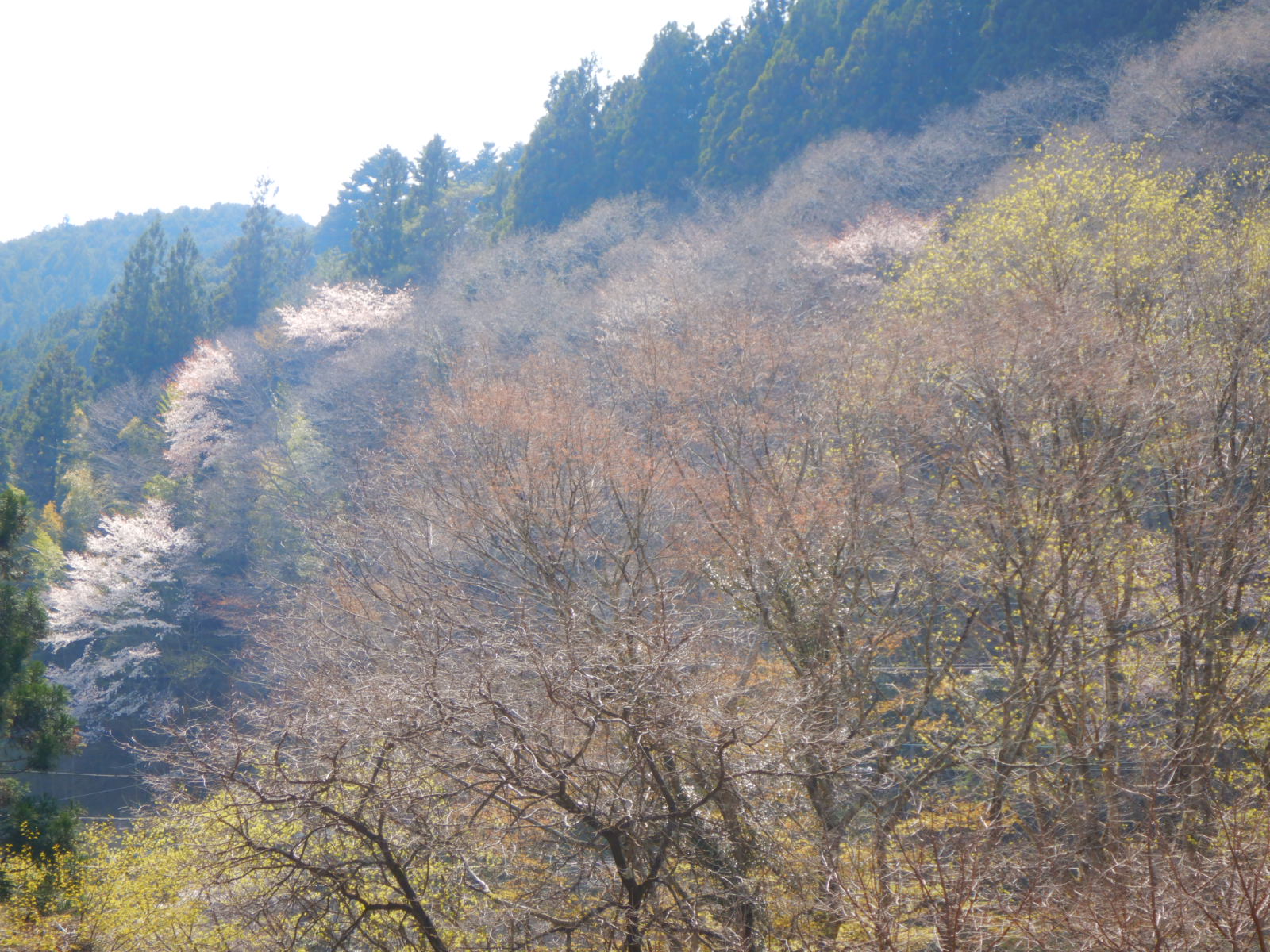 芽吹き始めた淡い色の山のあちらこちらに山桜が咲いていました。