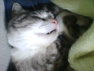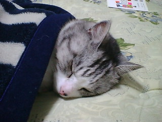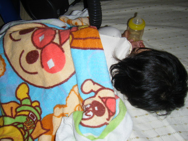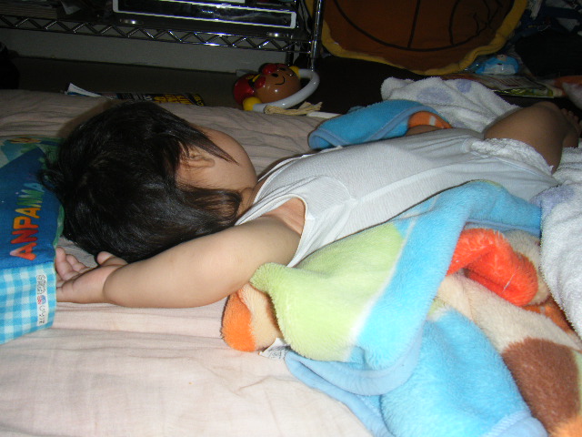 こんばんわ。皆さん4月も後2日で終わります。早いですね。今日は大変な事がありました。下の子と上の子が遊んでいたらいきなり下の子が泣き出したのでどうしたのかな?って見てみたら大量の鼻血!!!!!!!!!ビックリして上の子に聞いてみたら「遊んでいてペットボトルでお鼻をたたいてしまった。」私はパニックってしまいました。まだ主人が広島に戻っていないので助かりましたが私1人だったらどうしていただろうと・・・上の子にもきついことをたくさん言ってしまい心に傷を作っていいないならいいのですが・・・救急病院ヘ連れて行き急患でレントゲンと診察をしてもらいました。鼻自体に問題は無く折れてもいませんでした。ただ、粘膜を傷つけているようだという事で、「1週間気をつけてください。」と言われました。とりあえず一安心。主人の母も駆けつけてくれました。なんだか疲れた1日でした。「男の子だとこういう心配はこれからたくさんあるよ!」と主人の母に言われてドキドキです・・・・ペットボトルがからだったからよかったものの中に入っていたらどうなっていたか考えるととっても恐ろしいです。せっかく楽しく1日をすぐしていたのになんだかブルーになった私、皆さんも怪我には気をつけてくださいね。最後に癒されるサスケの寝顔を記載しておきます。