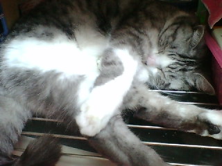 みなさん、こんにちわ。いつも観覧、暖かいコメントありがとうございます。今日も私が住んでいるところは晴天です。気温が昨日は最高で34もあったそうです。もう夏ですね・・・・って、梅雨は?????昨日喧嘩していた長男が戻ってきたのは前回のブログで書いていたと思います。しっかりと反省したようで泣きながら謝ってきました。私も、ドアを蹴って怖い思いをさせた事を謝りました。これで少しは反省してくれていればいいのですが・・・昨日、夜、下の子がいきなり泣いて駆けつけると口からすごい血が出ていたんです。床によだれと一緒にしたたっていたのであんまりビックリして口の中見たらうえ唇をきっていたようで他にもきっていたらいけないと思って実家の父に電話したら不機嫌そうに「なんね?上の子は?」っていわれて・・・あ、まだ土曜日の件を怒っていると思い「マナが怪我して口から血がでよるけん見てほしくて電話したけれど、機嫌も悪そうだしもういい!」といって電話を切り救急病院へ連れて行きました。行ってる途中で、実家の父から電話が入り「今どこか?」て、言われて「聖マリアに連れて行きよるけんもういい」と、「そうか。。舌をきっていないなら大丈夫やけんね」と言って電話を切られてしまいました。どうやら、家に来たようですが電気がついていなくて車も無かったから電話してきたようでした。救急病院に着くとたくさんの患者さんがいました。しかも新型インフルエンザ対策として入り口は1つでサーモグラフみたいなところを通らされて消毒もさせられました。徹底ぶりです。ちょっと安心して病院内へ。。。1時間くらい待って呼ばれてはいって行ったら舌のこの口の中を見て「うえ唇を切っただけのようです。心配いりません。血が出たって口の中ですからすぐになおります。」それだけ???ちらっと見ただけですよ。診察は2分とかからず・・・なんだか素っ気なく冷たい先生でした。支払いを待っている間うえの子が「ママ、お隣の人スイミングの先生に似ている」って言うのでそのお隣の方が「スイミングを教えていますが・・・」「やっぱり・・・・先生だ」ってうちの子言出し。。。先生が「お名前は?」うちの子名前言って幼稚園の名前言ったら「よく覚えているね。水着きていないのによくわかったね。賢い」と褒められました。先生は珈琲を飲もうとして機械から都合としたらおなかにかかってしまい水ぶくれがかなりすごくなって病院に来たそうです。子供がとっても心配をしていました。支払いまでの時間を話していたら先生は楽になったと言っていました。私は支払いは無かったので、診察券をもらってきたく。なんだかハードな1日でした。今のサスケこんな感じです。