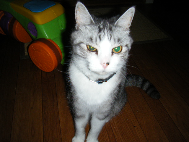 こんばんわ。皆さんお久しぶりです。なかなか更新出来なくてすみません。暖かいコメントや応援メッセージなどとっても嬉しかったです。今回は今までかけなかった分をたくさん記載します。まずは上の子の夏休み編です。7月下旬から夏休みに入りました。通知表ももらい、宿題も山のようにあり・・・パパが7月27日から7月31日まで帰ってきていて子供たちは大喜び。義理のお兄さんも一緒だったのでなおさら喜んで大変・・・8月1日は鹿児島へ帰る準備をして8月2日の夜につくように帰りました。母が遅出だったのであまり早く行っても大変なので____1週間の滞在でした。月曜日はいとこのお姉ちゃん達とランチ。火曜日と水曜日はショッピングや上の子が見たかった映画を見に行ったりとばたばたの日々・・・・そして木曜日から土曜日までは母が仕事だったので家でゴロゴロ。しかし土曜日は親戚のおじちゃんがお仕事お休みだったのでちょっと鳥刺しなどを買いにお出かけして晩ご飯を作り・・・日曜日は母がお休みだったのでお出かけするつもりが結局のんびり。日曜日には家に帰る予定だったので・・・桜島の火山灰がすごくて洗車とショッピングモールの往復です・・・じつは金曜日にあまりの体調の悪さに婦人かへ母についてきてもらったのですが・・・・「卵巣がはれています。おなかに赤ちゃんがいます。でもちょっと心音が・・・かかりつけの病院にお盆前に行かれて下さい。」って言われてしまいました。またこのことは後で書きます。義理の弟と約束があったので大急ぎで帰ったところオービスが光ってしまい、、、 来月がとっても不安です。それでは本日のサスケを1枚!