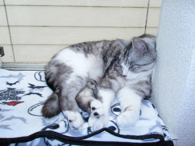 みなさん、こんにちわ。いつも観覧して頂きありがとうございます。最近はなかなかのペースでブログ更新をしている私です。ちょっと時間が出来たのでのんびりしていたら可愛い姿に出会えたのでブログ更新したくなりました。今日はとってもいい天気なんです。お布団を干していました。お昼を子供とサスケと食べてからお部屋にお布団を入れてちょっと洗い物をしていたらとても静かになったのでお部屋をのぞいていたら、干したてのお布団の上でサスケとマナ君がこの状態なんです。うちの子は変わった寝方をはじめするんです。しばらくすると体制がまたかわるんですけどね。寝始めのところのおしりにくっついていつの間にか眠っているサスケです。とっても可愛くないですか?2人とも?!干したてのお布団がよほど暖かくて気持ちよかったんですね。サスケはよくマナのそばで添い寝をするんです。私が体調が悪い時は私の横、子供たちが寂しそうな時は子供たちの横で添い寝をします。そうでない時は私と子供たちの間です・・・そろそろ幼稚園のお迎えにも行かないといけない時間なのにだいたい1時30分からお昼寝にはいるんですよね・・・起こして連れて行くのでいつも可愛そうです。。。