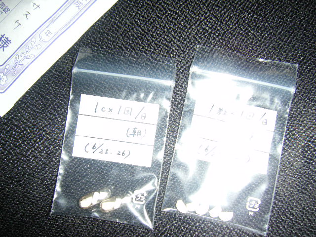 皆さんこんにちわ。いつも観覧訪問ありがとうございます。また暖かいコメントもありがとうございます。昨日の夜から私は眠れなくて起きていました。そしたらサスケの様子がおかしかったんです。トイレに行ったり来たりで。。。。しかも少し元気が無いように思えて・・・・いつもは添い寝してくれるのにトイレに近いところにいるんです。あんまりきになったのでトイレを掃除してから様子を見ていました。1時間置きにトイレに行っているんです。様子をのぞいても排水物がでた形跡は無く。。。。サスケがトイレが終わってから見に行ったのですが排水物の形跡は無く・・・7時頃にやっとうんちが出ていました。どうしてもきになった私は昔お世話になった動物クリニックに電話をしたんです。そこは先生がとっても親切な先生だったので安心して任せれるからと思って電話したら今日は休診日だったんです。不安だった私は自分の父に電話をして父の家の犬がお世話になっていてサスケが去勢した病院へ連絡してもらうことにしました。父は建築家のせいでしょうか、猫が嫌いなのですがサスケは可愛がってくれます。父は本当は現場が午前中に入っているにもかかわらず私の電話が入ってから「待っとけ」の一言で電話を切り10分もしないうちに家にきてくれました。サスケをバックに入れしおんを幼稚園に連れて行く準備をしてマナを一緒につれて動物病院へ・・・・動物病院で診察してもらい「尿がたまっていますね。膀胱炎ですね」「もしかしたら尿結石があり、石があるかもしれないので尿検査しましょうね」そして5分くらい待っていると検査結果がでました。やはり膀胱炎に尿結石がありました。綺麗なクリスタルみたいな感じです。先生が顕微鏡で見せてくれました。(テレビモニターに映し出されて。)尿結石があると腎臓に負担がかかりそういった場合は腎臓の働きの低下がある恐れがありそうなると入院、点滴になるそうなのです。そのため、先生が「お母さんも心配でしょうから、血液とって検査しましょうか?」と言われて「是非お願いします。」の返事・・・・血液とって検査したら腎臓の低下は見られなかったので薬と食事で治療していくことになりました。ひとまず安心でした。先生も、「早く見つけてくれてありがとう」と言ってもらえました。でも、サスケが1番頑張りました。そして治療費がすごい・・・・約¥10,000くらい。私は手持ちが¥5,000しかなかったので父が半分立て替えてくれました。残りはパパの給料が入ったらお支払いです。父は「うちの犬は1回¥20,000近くいくけん安かもんたい」の一言!家に着いたのが10時30分頃!仕事に行くのかと思いきや近くのスーパーに「牛乳買いに行くけん一緒にくるか?」と言われて「私もリンゴジュースと納豆を買い足しにいきたいけん行く」といって一緒に私の家の近くのスーパーへ。そこで唐揚げとかどんどん入れるから、父に「唐揚げ食べんやろう?」と聞いたら「マナに食べさせると。」といってコロッケや餃子の王将の餃子やお肉などをたくさんかごへ。。。私は目が点。そして最後に言われた言葉が「もう他に無いか?」え????結局スーパーで¥2,000以上のお買い物。そして代金はすべて父。父は私の家の分まで買ってくれて自分の家の分と分けて私の家まで運んでくれて「仕事行くけん、夕方子供たちつれてお風呂においで。」と言い残しトラックで帰って行きました。本当に父には感謝です。これがサスケのお薬そしてしばらくは病院食に変更!約1ヶ月分になるように先生が試供品を一緒に3つもくれました。そしてこれが病院食の2キロ分 これが¥4,000くらいするんです。そして今のサスケです。少しは落ち着いたかな?今日は本当に父に感謝する日です。サスケも早く元気になってね。