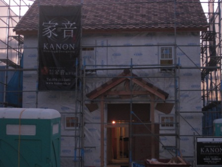只今せっせと幼稚園のバザーに出すハンドメイド品を作っています。来週には提出しなければならないのにちーーーーっともはかどりません…ぅぅ(p_q。)゚。なのに現実逃避の為、ブログをせっせと更新中。台風一過の翌日。夕方に現場に行ったら、サッシが付いていましたよ。ゎーィ♪ヽ(*´∀`)ノ ん~、お向かいさんの簡易トイレが邪魔ですが、東側の正面はこんな感じデス。予算の関係上格子は東と西側にしか付けられなかったのですが、やっぱり格子窓はカワイイですね棟梁にもいい雰囲気だと誉められちゃいました。(*′艸`)テヘッ♪