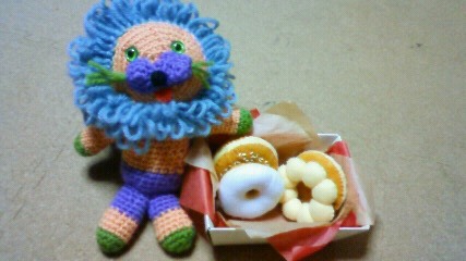 フェリのキットのあみぐるみがようやく完成しました。チビ王子の誕生日プレゼントのつもりだったのに、一ヶ月も遅れちゃいました^^;チビ王子に見せると、嬉しそうに「ガオ、ガオ。」 と抱っこして、自分のおっぱいをあげる真似をしていました~。なぜか尻尾がおしっこに見えるらしく、尻尾をさわって「ピーピ出た。」 と言っていました。そして、そしてずーーーっと気になっていた、チョキチクさんのキットにも手を出し、ようやく4個できました。ケーキから作ろうと思っていたのですが、王子様が自分でメニュー表まで書いていて「ドーナツがいい。」 と言うので、とりあえず4個作ったのに「全部出来上がるまで、遊ばない。」 と。チビ王子はチビ王子でプラステンをひっくり返して、リングをぜーんぶぶちまけて、リングの変わりにたった4個のドーナツを棒にさして大喜び。でも完成の日はまだ遠い…coco