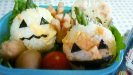 気がついたら今年も残りわずかですね~。今日はどんよりとしたお天気で、外はもう暗いです。枯葉が舞って、冬がやって来ようとしています。そろそろ本格的な冬支度しなくちゃ★時期が過ぎてしまいましたが、ちょうど10月31日がお弁当の日だったので、ジャックオランタンを作ってみました。かぼちゃのへた(?)部分を王子様の嫌いなアスパラにしたら、スゴイ嫌な顔をされちゃいました。お茶で流し込んで食べたそうです^^;coco