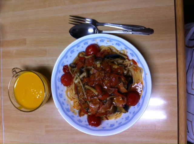 久しぶりに、にパンプキンスープとアラビアータ(少し具を増やしたけどね。)…茄子・しめじ・プチトマト・玉葱かな?