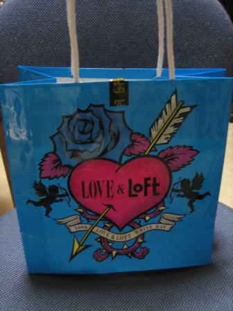 「ホワイトデーのお返し買いに行って来る!」っと言う息子に「ふ~ん、誰と?どこまで行くの?」「○○と●●と3人で梅田まで、、」「えっ?梅田まで行かなくてもその辺で買えるやんっ、、」っと言ったのに「じゃ~ね♪」っと行ってしまった、、うちの息子は小さい頃からどこへ行くにも車で出かける事が多かったので今年15歳になるというのに一人で電車やバスに乗るのが苦手、、かといって今は母親と並んで歩くのも避けたいお年頃、、父親は人一倍歩くのが嫌な男だし、、ここは遊びなれた友人とあっちこっちと出かけさすのも勉強になるかも、、梅田と聞いて、、ちょっと心配だったんだけどほら、かつあげとか、、喧嘩売られたりとか、、ま、それも勉強になるか、、ってどんな親やねんっ!!数時間後、そんな心配はよそに嬉しそうに帰って来ました、、こんなとんでもなく派手な紙袋をさげて、、「いいのがあって良かったわぁ~」って満足気その満足感って要はホワイトデー仕様のど派手な紙袋をさげて歩いた事にあるんじゃないか??「僕はチョコを貰ったからお返しを買って来たんだぁ」みたいな、、そう言えばバレンタインの当日も普段でかいバッグを下げているくせに中には仕舞いこまずにしっかとチョコを手に帰って来てたよなぁ、、自慢かいっ!!!~追記~お返し代は協力してな~~って、、
