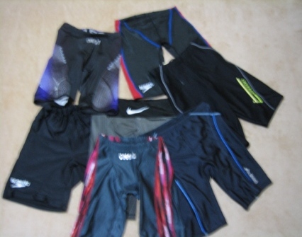 息子愛用の水着たち、、一番のお気に入りは上段左端、、ぼちぼちお尻が透けてきました、、まぁ透けたってどうってことないけど、、(笑)近頃発表された英スピード社製の水着、、タイムが0.5秒アップするらしい、、、