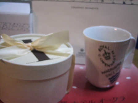 昨日の朝の旦那にはむかついたけどその夜の旦那には感激した、、カレーを散々いじり倒した後出かけて行った旦那、、部屋から一歩も出なかった私は(早い話、休日の朝は主婦放棄を決め込んで起きない)今日の旦那の予定もまったく無関心、、、もともといちいちその日の予定を語り合うような夫婦でもなししいて言えば出かける際のファッションで「ん?今日はなに??どこ行くの??」ってかんじ、、で、今日は帰宅するまでスーツを着て京都まで行ってたなんて知らなかった訳、、久々に飲み過ぎでよれよれなって帰宅した旦那、、「どこでそんなにしこたま飲んできたの?」っと聞けば「京都や、」っと大きな紙袋をドスンと置いた、、あれ??これって結婚式帰り??旦那の返答も待たずに次に出た言葉、「お祝いいくらしたの~??」って(笑)なんでもまったく見ず知らずの家庭からの御呼ばれだったらしいてゆうか、、早い話「興業」だな、、なのでこちらがギャラを貰う立場、、しかも引き出物もしっかり手渡されたそうで早速中身を拝見~♪引き出物ってものすご~くセンスが分かれるものでしょケースごとお蔵入りするものもあればおっ!これは使えるぞ!って思ったり、、今回はかなりヒット!☆しかも私の「ど真ん中~」中でもロイヤルコペンハーゲンのマグカップは超嬉しいぞ~~加えてKIHACHIのバームクーヘンもね!素晴らしいセンスが光っている(見ず知らずの)若いお2人の幸せな門出を祝福させて頂きま~~す(笑)ちゃ~んと家まで無事持ち帰った旦那にも感謝!!!