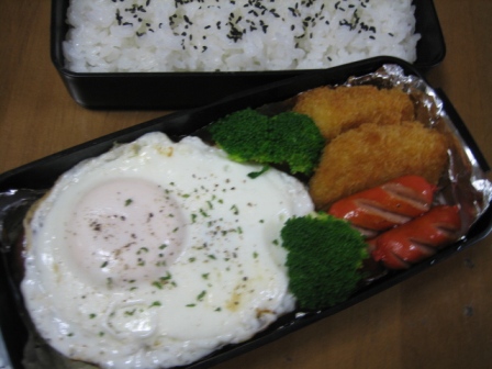 昼食時になって、、弁当箱を開けて、、この内容を見た途端、、息子はテンションが上がるらしい目玉焼の下はもちろんハンバーグね!で、その下は千切りキャベツのバターソテーちょっと炒めると生よりぐんとおかずになるらしい、、ちなみに目玉焼の上にかかっているのはパセリです~普段はブラックペッパーが大量にかかってるんだけど、、今日はパセリにしてみました、、息子は旦那の影響で香辛料が好き、、思い起こせば3歳くらいからゴリゴリとペッパーミルを使う小生意気なガキでした、、。