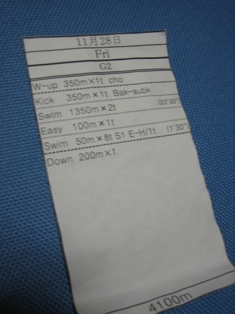 期末考査を終えストイックな生活から一時解放された息子なまる身体をくたくた、ぼろぼろになるまでどうにかしたいと言う思いから今夜は早速泳ぎに出かけたようです、、これが今夜のメニュー↓私には分からない専門用語がずらり、、要するに4100メートル、このメニューを2回泳いできたらしい、、すなわち8200メートル???そんな距離、泳ぐのも走るのも私には未知の世界じゃ、、お望みとおりのくたくたぼろぼろ状態になった息子はかなりhighな笑顔を浮かべて帰って来ました~☆怖っ!(笑)