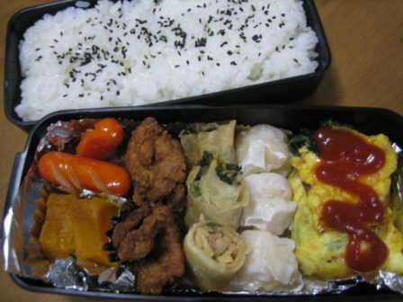 今日のお弁当唐揚げ、シュウマイ、春巻き、ウインナー、ホウレン草のオムレツ、カボチャの煮付け、、私のお弁当って彩り悪いしセンスも悪い、、なんせオナゴがいないもんで、、加えて「トマト入れるな」「フルーツ入れるな」「かわいい系はやめてくれ」と言われりゃ体育会系弁当になってしまうわなぁ、、でも息子の納得弁当だからいいっしょ、、一緒に食べてるF君のお弁当は一言で言うと「綺麗!」らしい、、例えばカニカマを巻いた卵焼きだったり色々と手が込んでるらしい、、息子いわく、、「だから見た目は卵焼きにしろ 絶対Fの方が美味そうに見えるねん で、一回Fの卵焼き食べた事あるねんけど 甘くてうちのとは全然違う味やったわ、、 俺は美味いと思えへん、、」と言う事で息子の場合は見た目より味重視だそうです、、でも反対にF君が我が家の卵焼きを食べた場合も「俺は美味いと思えへん」って事になるんじゃないのぉ?(笑)