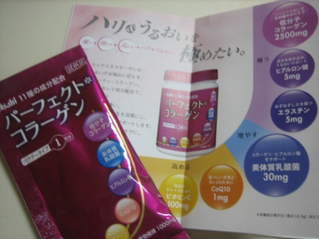 ブログ友のあるふぁべっとちゃんからの頂き物、パート2です~アサヒフードアンドヘルスケアの「パーフェクトコラーゲン」従来のコラーゲンとの違いは11種の成分配合です、、今や「低分子コラーゲン」は当たり前ですがこれにはヒアルロン酸エラスチン植物繊維ビタミンC4種のハーブミックスCoQ10そして美体質乳酸菌が配合されています、、これはコラーゲンを効率的に補えるように吸収をサポートする成分だそうです、、それぞれの相乗効果でハリとうるおいを極めるのだ~~~ちなみに、、私が定番としているL社のコラーゲンと比較してみると明らかに飲みやすくお薦めだと思います、、L社のコラーゲンはコーヒーに入れると激マズ完璧NGなのに比べ「パーフェクトコラーゲン」はまったく無味無臭でgoodと言う事で私はL社からこちらに変更決定ですねあるふぁべっとちゃん、いいものをありがとう~