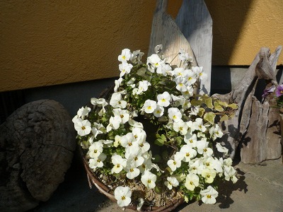 秋田は昨日、今日と雨が降っています。なので、写真は先週撮ったもの。昨年秋に、白とアイボリーのビオラをハンギングの小リースに三株植えました。隙間にはアイビーもちょっとだけ。いつになったら、溢れ出すくらい育つのか、と楽しみにしていましたが★先週の暑さで、ビオラが終わりかけてきました・・・。溢れ出したら、壁にかけよう~♪・・・は夢に終わってしまったわ。とりあえず、記録として残しておこうとUPします。リースは浅いので他の鉢より、乾きやすかったみたい。私みたいにあまり水をやらない人向けではないですね・・・。水をあげるのが大好きな人向けのハンギングリースだわ。来年は、もうやめようかしら。リースって可愛いからついトライしちゃうのだけれど。去年はサフィニアを植えて、水を切らして殺しちゃったし★手間暇かけなければならない植物は、私にはダメダメ~。私には水をあげなくても生きられる乾燥に強い植物がいい!!すっごくかわいいリース。↓どなたか挑戦しませんか~?!【初回限定/厳選送料無料】ビオラ/ベゴニア/一年草9cmポット向き/リース型プランターのセット【人気商品】(お試し)花苗で作るハンギングリース(小サイズ)