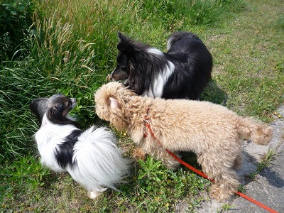 トイプー8ヶ月のもこちゃん。とっても人が好き♪始めての人にも、お尻ふりふり、ご挨拶。こんなに人懐っこいと誘拐されても、生きていけそう。とってもかわいい女の子♪おうちの中でもいたずら大好きみたいで。絶えず話題を振り撒いている模様。おきゃんな彼女に、おしとやかなお姉さんのシェルティーのラブちゃん、あっしゅ同様、ウルサイ妹分にまいっているのかな?もこちゃん、自分より小さくて、一番歳が近いちゃーむに興味深々。お尻の匂いを嗅ぎたくてウズウズしてました。ちゃーむ「うるさいの~、もこちゃん!」って言ってますが★あっしゅから見たら、ちゃーむもかなりウルサイですヨ。。。若いコって、パワーがあるなぁ!くるくる目が回るくらい、動き回って!!日々ちゃーむがウルサイので、これ以上ウルサイのは嫌って感じで、あっしゅなんて、初めから近くに寄りません。「早く海に行こうよ~!!」って、言ってました。以上、昨日の話題ですぅ。今日は風がとても強く、砂が舞っていたので写真は無し!川に波が立つくらい、あっしゅが流されてしまうくらいの強風。おうちへ帰ってバラの巡回をすると・・・。ピエール・ドゥ・ロンサールのシュートが折れてる★★★先日の強風ではソンブレイユのシュートがやられたし★★フランシーヌ オースティンのシュートもやられました★今年はやたら風が強い。。。虫と同じくらい、風がネックかも・・・。↓こんな商品あるけれど。今更って感じでしょうか?それとも、まだ間に合う?!薔薇の壁面誘引にも【Bells More】 つりがねくん 12個いり