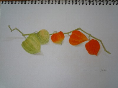 昨年の今頃、色鉛筆で初めて描いたのが、ほおずき。「義理の母がコレ、描いたら?」って、くれたので。描いてみたが、難しかったなぁ。。。膨らんでる所とか。凹んでるところとか。初めての色付けでどの色から塗っていけばいいのかとか。「せんせい~。」「せんせ~。」「せん・・・・」と何度読んだか(笑)とりあえず、完成した時に「二度とほおずきは描きたくない!」と思ったほどだ。これも、二ヵ月くらいかかったと思うんだけど。。。(のんびり描くので。)どうしても、この絵は好きになれない・・・。下書きの時点で、何か違う~と思った場所が、最後まで違ったままだった★絵は下書きが大事なんだなぁ・・・って思ったっけ。封印してしまおうかと思ったが。とりあえず、初めての作品だもの。順番にアップしていかなくっちゃ。。。余談ですが、ほおずきって食べられるのね。検索かけたら、秋田県産のカステラ、ほおずきが使われてた!!初めて見た~。地元なのに(笑)今度見かけたら買ってみよっかな?↓甘酸っぱくてフルーティー♪ビタミンたっぷり!とってもヘルシー★ほおずきの実を丸ごと使ったカステラです♪ほおずきカステラ[上小阿仁名物 ほおずきのお菓子]【秋田県上小阿仁村特産・食用ほおずき使用】【箱入り】【各種のし対応】【常温発送】※実を丸ごと使用していますので小さな種が入っております